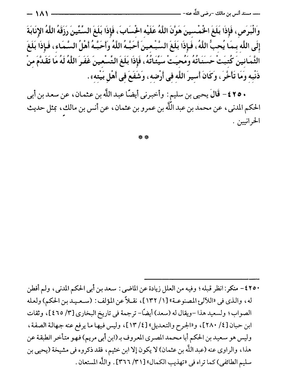 ٤٢٥٠ - قَالَ يحيى بن سليمٍ: وأخبرنى أيضًا عبد الله بن عثمان، عن سعد بن أبى الحكم المدنى، عن محمد بن عبد الله بن عمرو بن عثمان، عن أنس بن مالكٍ، بمثل حديث الحرانيين.