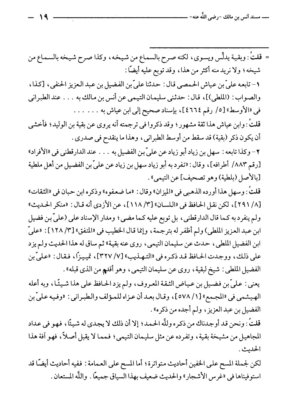 ١ - تابعه عليّ بن عياش الحمصي قال: حدثنا عليّ بن الفضيل بن عبد العزيز الحنفى، [كذا، والصواب: (الملطى)]، قال: حدثنى سليمان التيمي عن أنس بن مالك به ... عند الطبراني في "الأوسط" [٥/ رقم ٤٦٦٤]، بإسناد صحيح إلى ابن عياش به ......