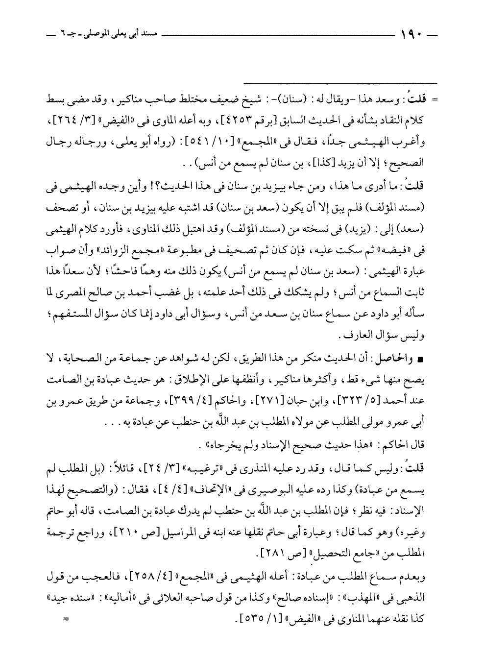 قلتُ: ما أدرى ما هذا، ومن جاء بيزيد بن سنان في هذا الحديث؟! وأين وجده الهيثمى في (مسند المؤلف) فلم يبق إلا أن يكون (سعد بن سنان) قد اشتبه عليه بيزيد بن سنان، أو تصحف (سعد) إلى: (يزيد) في نسخته من (مسند المؤلف) وقد اهتبل ذلك المناوى، فأورد كلام الهيثمى في "فيضه" ثم سكت عليه، فإن كان ثم تصحيف في مطبوعة "مجمع الزوائد" وأن صواب عبارة الهيثمى: (سعد بن سنان لم يسمع من أنس) يكون ذلك منه وهمًا فاحشًا؛ لأن سعدًا هذا ثابت السماع من أنس؛ ولم يشكك في ذلك أحد علمته، بل غضب أحمد بن صالح المصرى لما سأله أبو داود عن سماع سنان بن سعد من أنس، وسؤال أبى داود إنما كان سؤال المستفهم؛ وليس سؤال العارف.