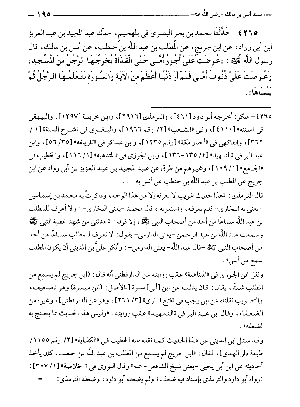 ٤٢٦٥ - حَدَّثَنَا محمد بن بحرٍ البصرى في بلهجيمٍ، حدّثنا عبد المجيد بن عبد العزيز بن أبى روادٍ، عن ابن جريجٍ، عن المطلب بن عبد الله بن حنطبٍ، عن أنس بن مالكٍ، قال رسول الله - صلى الله عليه وسلم -: "عُرِضَتْ عَلَيَّ أُجُورُ أُمَّتِى حَتَّى الْقَذَاةُ يُخْرِجُهَا الرَّجُلُ مِنَ الْمسْجِدِ، وَعُرِضَتْ عَلَيَّ ذُنُوبُ أُمَّتِى فَلَمْ أَرَ ذَنْبًا أَعْظَمَ مِنَ الآيَةِ وَالسُّورَةِ يَتَعَلَّمُهَا الرَّجُلُ ثُمَّ يَنْسَاهَا".