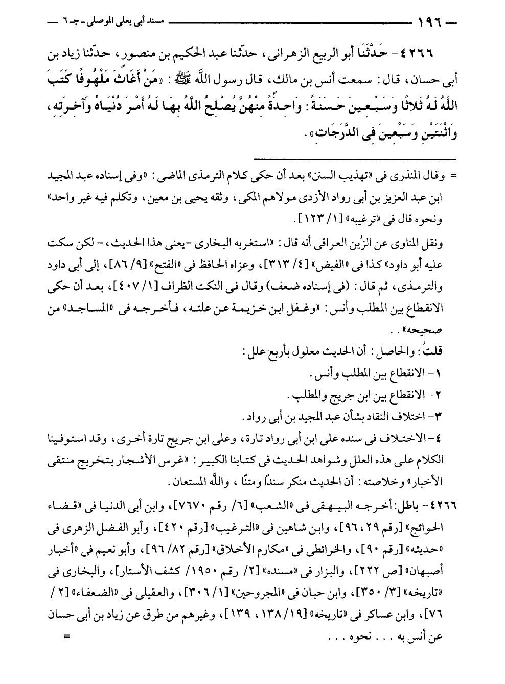 ٤٢٦٦ - حَدَّثَنَا أبو الربيع الزهرانى، حدّثنا عبد الحكيم بن منصورٍ، حدّثنا زياد بن أبى حسان، قال: سمعت أنس بن مالكٍ، قال رسول الله - صلى الله عليه وسلم -: "مَنْ أَغَاثَ مَلْهُوفًا كَتَبَ اللهُ لَهُ ثَلاثًا وَسَبْعِينَ حَسَنَةً: وَاحِدَةً مِنْهُنَّ يُصْلِحُ اللهُ بِهَا لَهُ أمْرَ دُنْيَاهُ وَآخِرَتِهِ، وَاثْنَتَيْنِ وَسَبْعِينَ فِي الدَّرَجَاتِ".