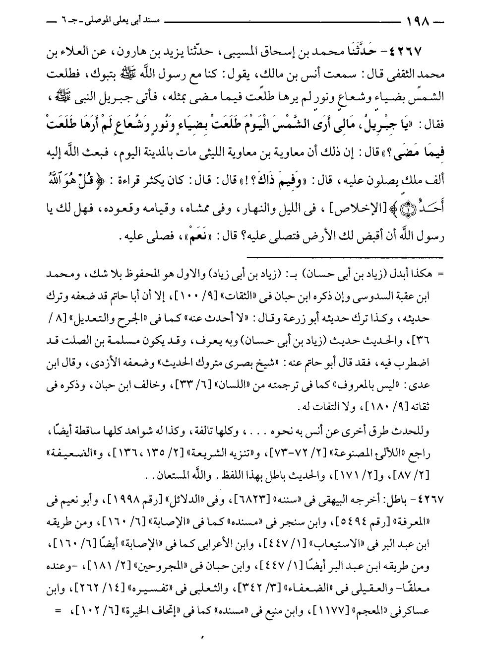 ٤٢٦٧ - حَدَّثَنَا محمد بن إسحاق المسيبى، حدّثنا يزيد بن هارون، عن العلاء بن محمدٍ الثقفى قال: سمعت أنس بن مالكٍ، يقول: كنا مع رسول الله - صلى الله عليه وسلم - بتبوك، فطلعت الشمس بضياءٍ وشعاعٍ ونورٍ لم يرها طلعت فيما مضى بمثله، فأتى جبريل النبي - صلى الله عليه وسلم -، فقال: "يَا جِبْرِيلُ، مَا لِي أَرَى الشَّمْسَ الْيَوْمَ طَلَعَتْ بِضِيَاءٍ وَنُورٍ وَشُعَاعٍ لَمْ أَرَهَا طَلَعَتْ فِيمَا مَضى؟ " قال: إن ذلك أن معاوية بن معاوية الليثى مات بالمدينة اليوم، فبعث الله إليه ألف ملكٍ يصلون عليه، قال: "وَفِيمَ ذَاكَ؟! " قال: قال: كان يكثر قراءة: {قُلْ هُوَ اللَّهُ أَحَدٌ (١)} [الإخلاص]، في الليل والنهار، وفى ممشاه، وقيامه وقعوده، فهل لك يا رسول الله أن أقبض لك الأرض فتصلى عليه؟ قال: "نَعَمْ"، فصلى عليه.