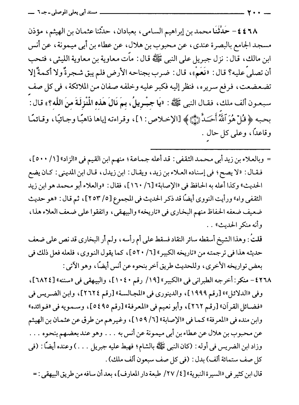 ٤٤٦٨ - حَدَّثَنَا محمد بن إبراهيم السامى، بعبادان، حدّثنا في مان بن الهيثم، مؤذن مسجد الجامع بالبصرة عندى، عن محبوب بن هلالٍ، عن عطاء بن أبى ميمونة، عن أنس بن مالكٍ، قال: نزل جبريل على النبي - صلى الله عليه وسلم - قال: مات معاوية بن معاوية الليثى، فتحب أن تصلى عليه؟ قال: "نَعَمْ"، قال: ضرب بجناحه الأرض فلم يبق شجرةٌ ولا أكمةٌ إلا تضعضعت، فرفع سريره، فنظر إليه فكبر عليه وخلفه صفان من الملائكة، في كل صفٍّ سبعون ألف ملك، فقال النبي - صلى الله عليه وسلم -: "يَا جِبْرِيلُ، بِمَ نَالَ هَذِهِ المنْزِلَةَ مِنَ اللهِ؟ " قال، بحبه {قُلْ هُوَ اللَّهُ أَحَدٌ (١)} [الإخلاص: ١]، وقراءته إياها ذاهبًا وجائيًا، وقائمًا وقاعدًا، وعلى كل حالٍ.