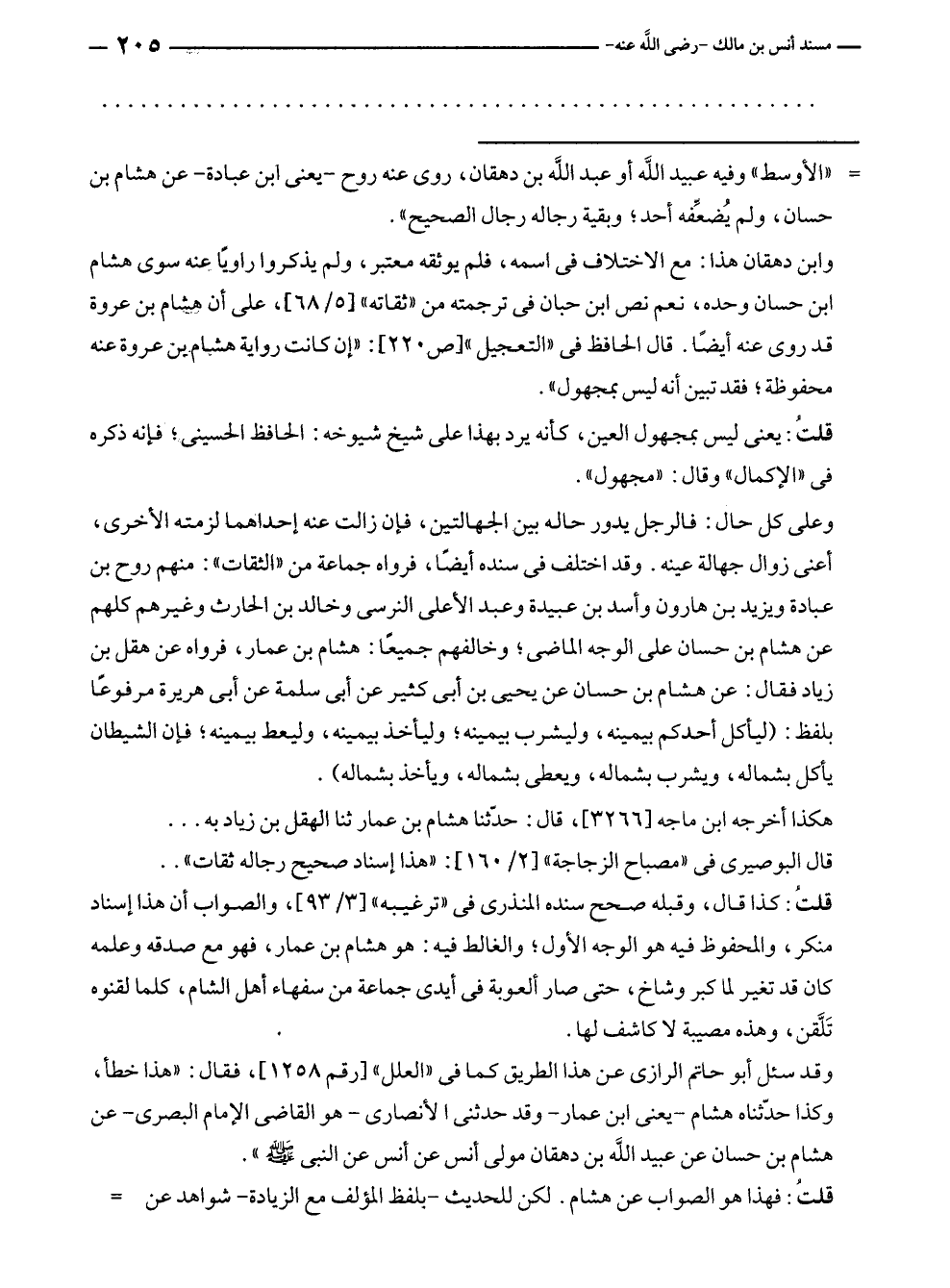 = "الأوسط" وفيه عبيد الله أو عبد الله بن دهقان، روى عنه روح - يعنى ابن عبادة - عن هشام بن حسان، ولم يُضعِّفه أحد؛ وبقية رجاله رجال الصحيح".
