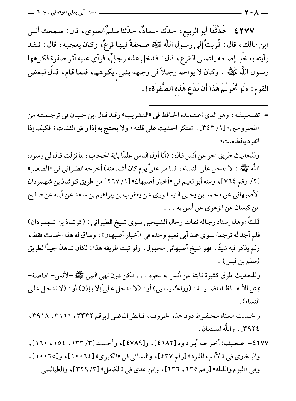 ٤٢٧٧ - حَدَّثَنَا أبو الربيع، حدّثنا حمادٌ، حدّثنا سلمٌ العلوى، قال: سمعت أنس بن مالكٍ، قال: قُربتٌ إلى رسول الله - صلى الله عليه وسلم - صحفةٌ فيها قرعٌ، وكان يعجبه، قال: فلقد رأيته يدخل إصبعه يلتمس القرع، قال: فدخل عليه رجلٌ، فرأى عليه أثر صفرةٍ فكرهها رسول الله - صلى الله عليه وسلم -، وكان لا يواجه رجلًا في وجهه بشئٍ يكرهه، فلما قام، قال لبعض القوم: "لَوْ أَمَرْتُمْ هَذَا أَنْ يَدَعَ هَذِهِ الصُّفْرَةَ"!.
