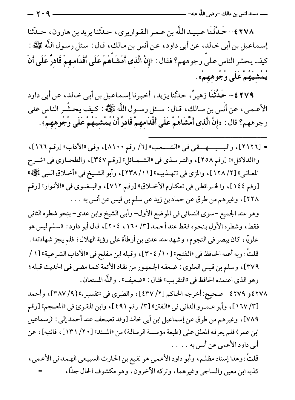 ٤٢٧٨ - حَدَّثَنَا عبيد الله بن عمر القواريرى، حدّثنا يزيد بن هارون، حدّثنا إسماعيل بن أبى خالدٍ، عن أبى داود، عن أنس بن مالكٍ، قال: سئل رسول الله - صلى الله عليه وسلم -: كيف يحشر الناس على وجوههم؟ فقال: "إِنَّ الَّذِى أَمْشَاهُمْ عَلَى أَقْدَامِهِمْ قَادِرٌ عَلَى أَنْ يُمْشِيَهُمْ عَلَى وُجُوهِهِمْ".