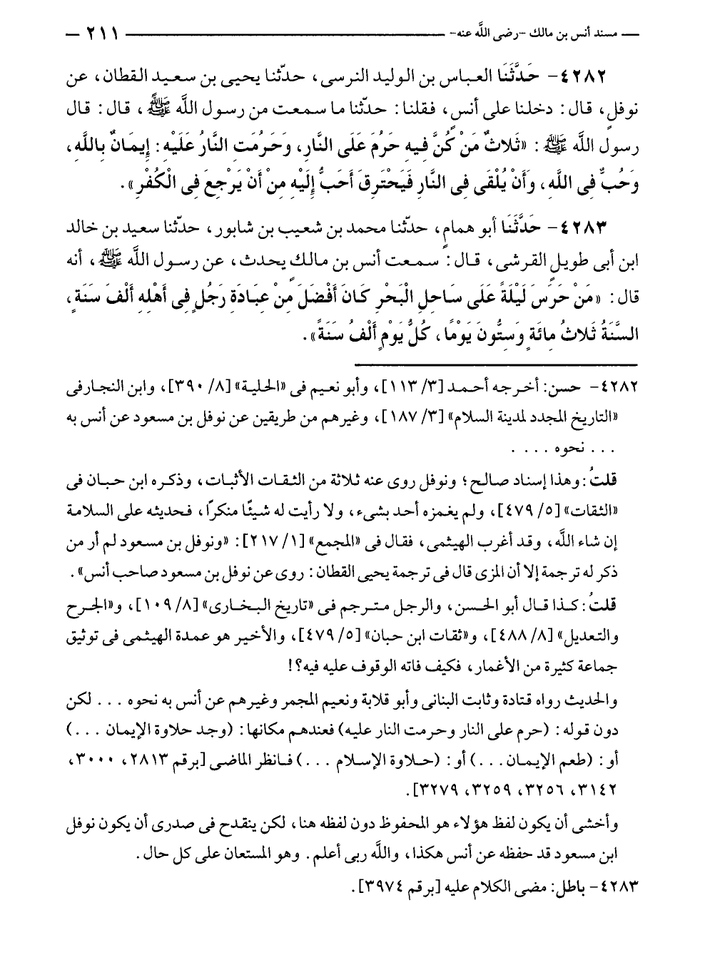 ٤٢٨٢ - حَدَّثَنَا العباس بن الوليد النرسى، حدّثنا يحيى بن سعيد القطان، عن نوفلٍ، قال: دخلنا على أنسٍ، فقلنا: حدّثنا ما سمعت من رسول الله - صلى الله عليه وسلم -، قال: قال رسول الله - صلى الله عليه وسلم -: "ثَلاثٌ مَنْ كُنَّ فِيهِ حَرُمَ عَلَى النَّارِ، وَحَرُمَتِ النَّارُ عَلَيْهِ: إِيمَانٌ بِاللهِ، وَحُبٌّ فِي اللهِ، وَأَنْ يُلْقَى فِي النَّارِ فَيَحْتَرِقَ أَحَبُّ إِلَيْهِ مِنْ أَنْ يَرْجِعَ فِي الْكُفْرِ".