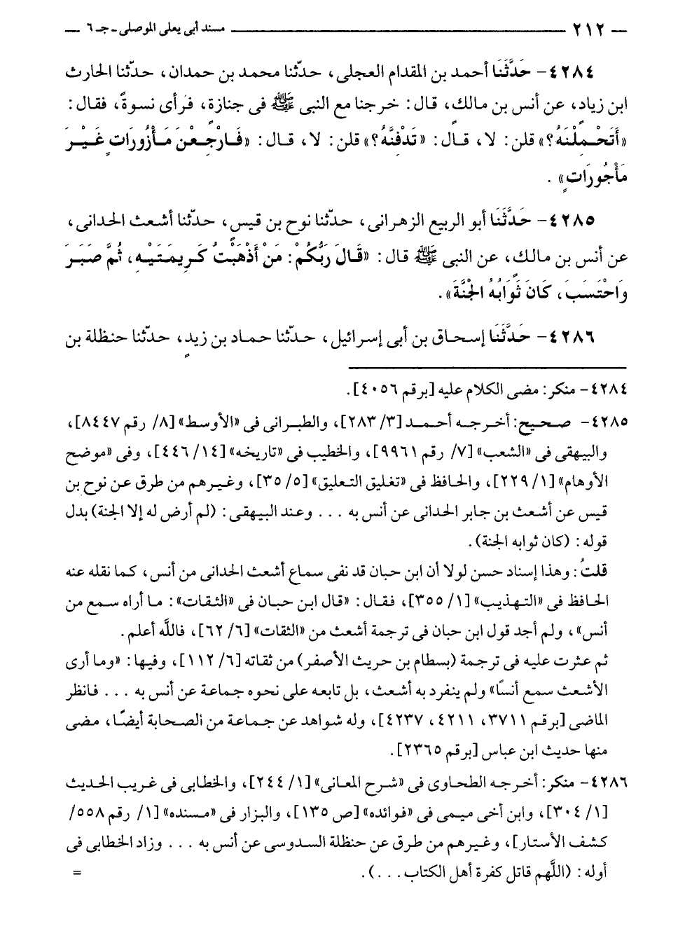 ٤٢٨٥ - صحيح: أخرجه أحمد [٣/ ٢٨٣]، والطبرانى في "الأوسط" [٨/ رقم ٨٤٤٧]، والبيهقى في "الشعب" [٧/ رقم ٩٩٦١]، والخطيب في "تاريخه" [١٤/ ٤٤٦]، وفى "موضح الأوهام" [١/ ٢٢٩]، والحافظ في "تغليق التعليق" [٥/ ٣٥]، وغيرهم من طرق عن نوح بن قيس عن أشعث بن جابر الحدانى عن أنس به ... وعند البيهقى: (لم أرض له إلا الجنة) بدل قوله: (كان ثوابه الجنة).