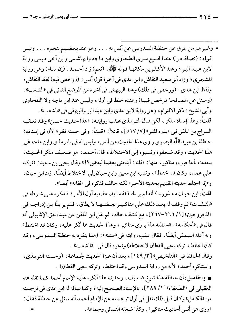 قلتُ: ابن حبان معذور، كأنه لم ير لحنظلة ما يضعف به أول الأمر؛ فذكره على شرطه في "الثقات" ثم وقف له بعد ذلك على مناكير بعضها لا يطاق، فلم ير بدًا من إدراجه في "المجروحين" [١/ ٢٦٦ - ٢٦٧]، مع كشف حاله، ثم نقل ابن الملقن عن عبد الحق الإشبيلى أنه قال في "أحكامه": "حنظلة هذا يروى مناكير، وهذا الحديث مما أنكر عليه، وكان قد اختلط" وبه أعله البيهقى أيضًا، فقال عقب روايته في "سننه": (هذا ينفرد به حنظلة السدوسى، وقد كان اختلط، تركه يحيى القطان لاختلاطه) ونحوه قال في: "الشعب".