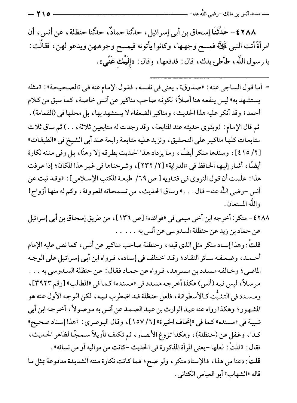 قلتُ: وهذا إسناد منكر مثل الذي قبله، وحنظلة صاحب مناكير عن أنس، كما نص عليه الإمام أحمد، وضعفه سائر النقاد؛ وقد اختلف في إسناده، فرواه ابن أبى إسرائيل على الوجه الماضى؛ وخالفه مسدد بن مسرهد، فرواه عن حماد فقال: عن حنظلة السدوسى به ... مرسلًا، ليس فيه (أنس) هكذا أخرجه مسدد في "مسنده" كما في "المطالب" [رقم ٣٩٢٣]، ومسدد في التثبُّت كالأسطوانة، فلعل حنظلة قد اضطرب فيه، لكن الوجه الأول عنه هو المشهور؛ وهكذا رواه عنه عبد الوارث بن عبد الصمد عن أنس به موصولًا، أخرجه ابن أبى شيبة في "مسنده" كما في "إتحاف الخيرة" [٦/ ١٥٧]، وقال البوصيرى: "هذا إسناد صحيح" كذا، وغفل عن (حنظلة)، وهكذا تزوغ الأبصار، ثم تكلف تأويلًا سمجًا لظاهر الحديث، فقال: "قلتُ: لعلها - يعنى المرأة المذكورة في الحديث - كانت من مواليه أو من نسائه".