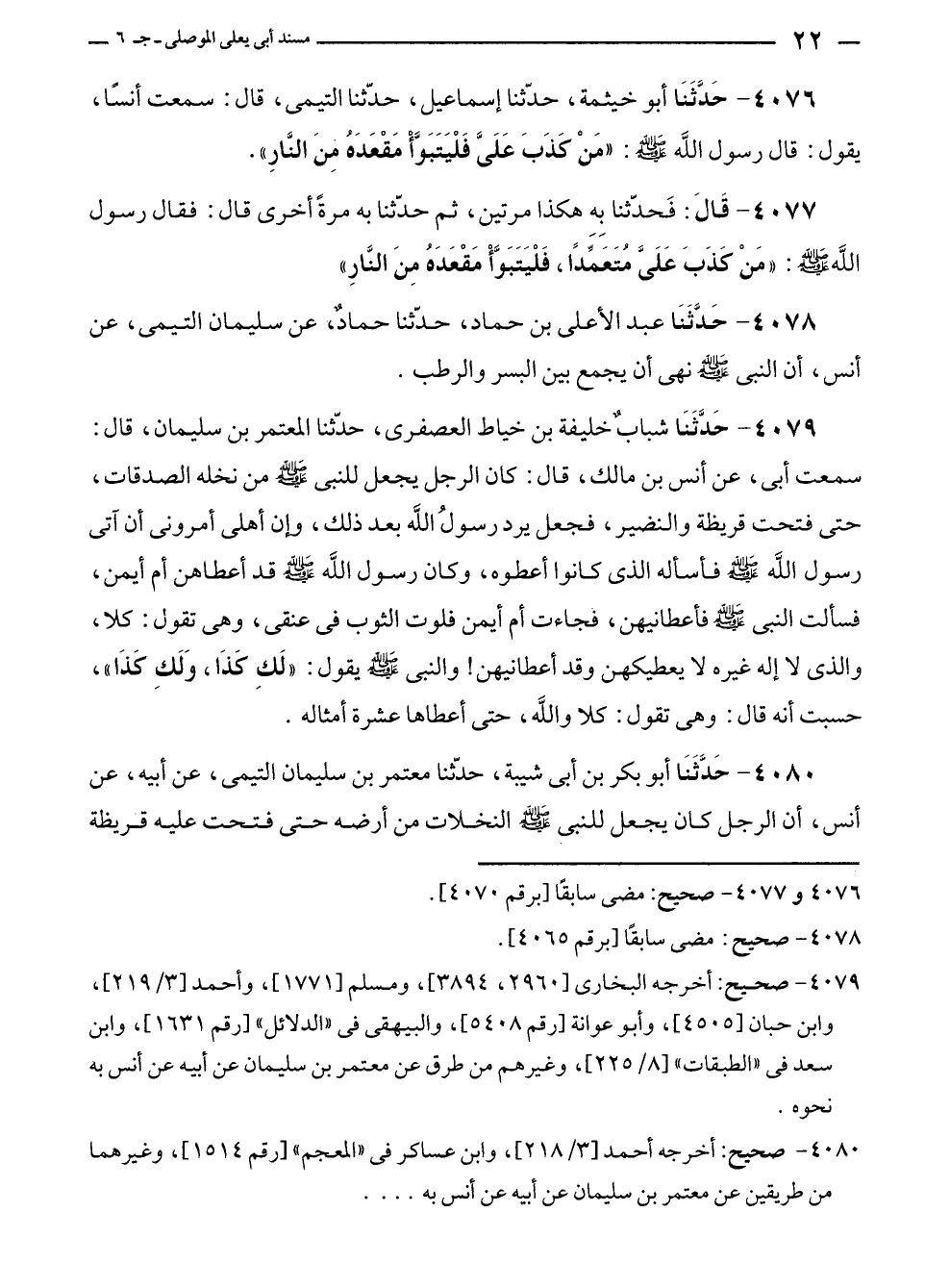 ٤٠٧٦ - حَدَّثَنَا أبو خيثمة، حدّثنا إسماعيل، حدّثنا التيمي، قال: سمعت أنسًا، يقول: قال رسول الله - صلى الله عليه وسلم -: "مَنْ كَذَبَ عَلَيَّ فَلْيَتَبَوَّأْ مَقْعَدَهُ مِنَ النَّارِ".