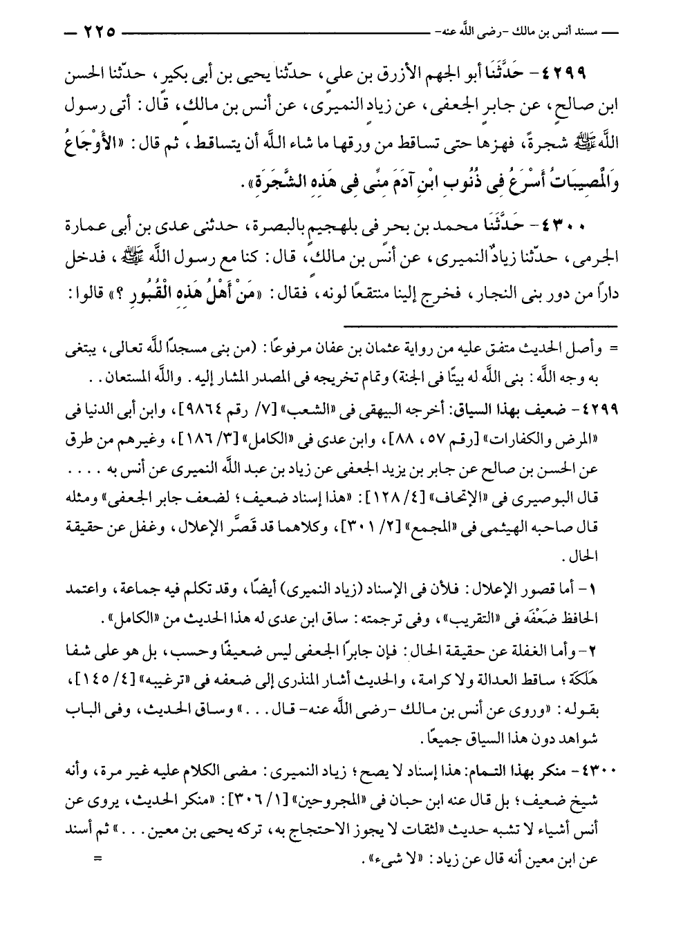 ٤٢٩٩ - حَدَّثَنَا أبو الجهم الأزرق بن علي، حدّثنا يحيى بن أبي بكيرٍ، حدّثنا الحسن بن صالحٍ، عن جابرٍ الجعفى، عن زيادٍ النميرى، عن أنس بن مالك، قال: أتى رسول الله - صلى الله عليه وسلم - شجرةً، فهزها حتى تساقط من ورقها ما شاء الله أن يتساقط، ثم قال: "الأَوْجَاعُ وَالْمُصِيبَاتُ أَسْرَعُ فِي ذُنُوبِ ابْنِ آدَمَ مِنِّى فِي هَذِهِ الشَّجَرَةِ".