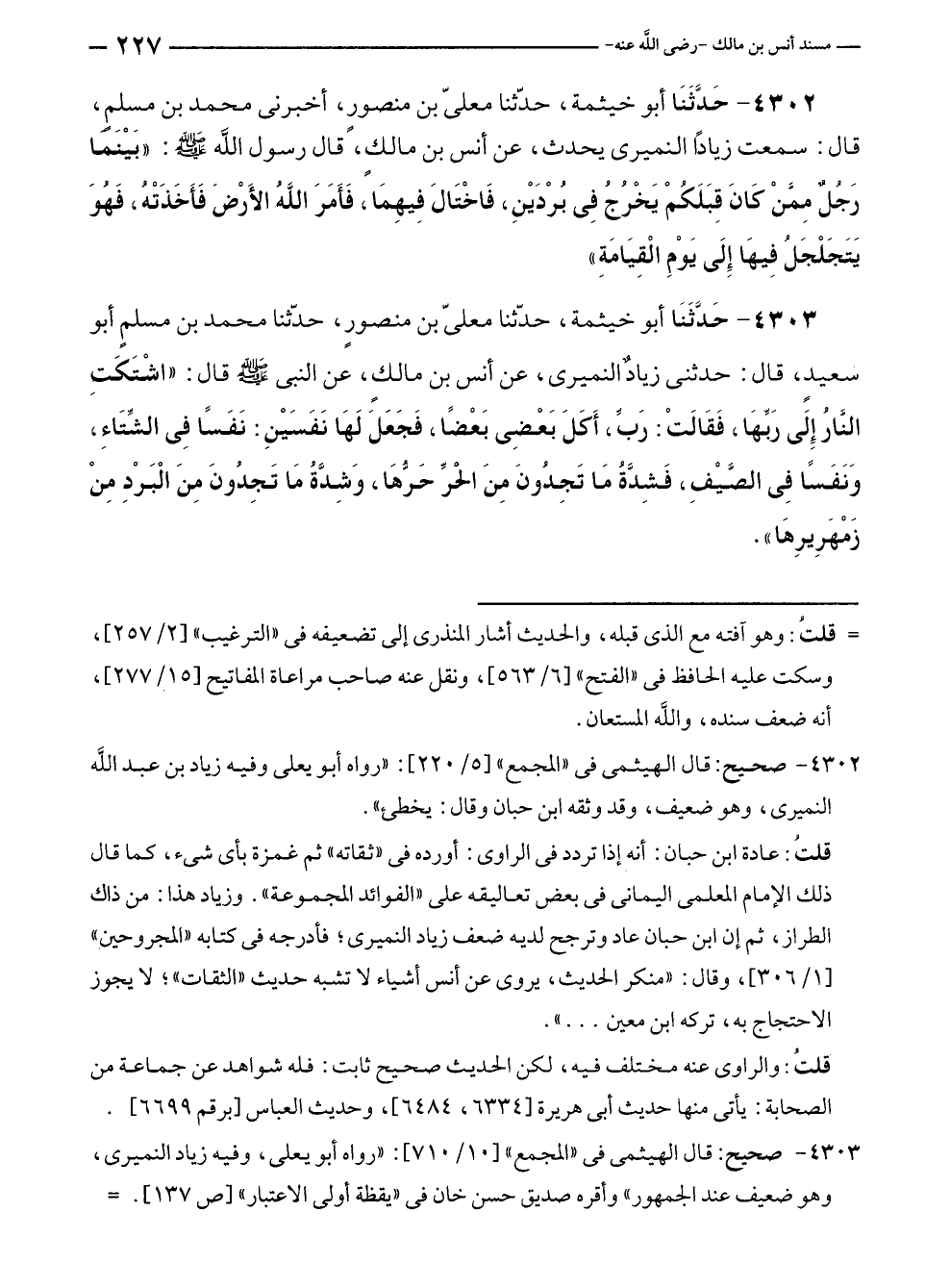 ٤٣٠٣ - حَدَّثَنَا أبو خيثمة، حدّثنا معلى بن منصورٍ، حدّثنا محمد بن مسلمٍ أبو سعيد، قال: حدثنى زيادٌ النميرى، عن أنس بن مالكٍ، عن النبي - صلى الله عليه وسلم - قال: "اشْتَكتِ النارُ إِلى رَبِّهَا، فَقَالَتْ: رَبِّ، أَكَلَ بَعْضِي بَعْضًا، فَجَعَلَ لَهَا نَفَسَيْنِ: نَفَسًا فِي الشِّتَاءِ، وَنَفَسًا فِي الصَّيْفِ، فَشِدَّةُ مَا تَجِدُونَ مِنَ الحرِّ حَرُّهَا، وَشِدَّةُ مَا تَجِدُونَ مِنَ الْبَرْدِ مِنْ زَمْهَرِيرِهَا".
