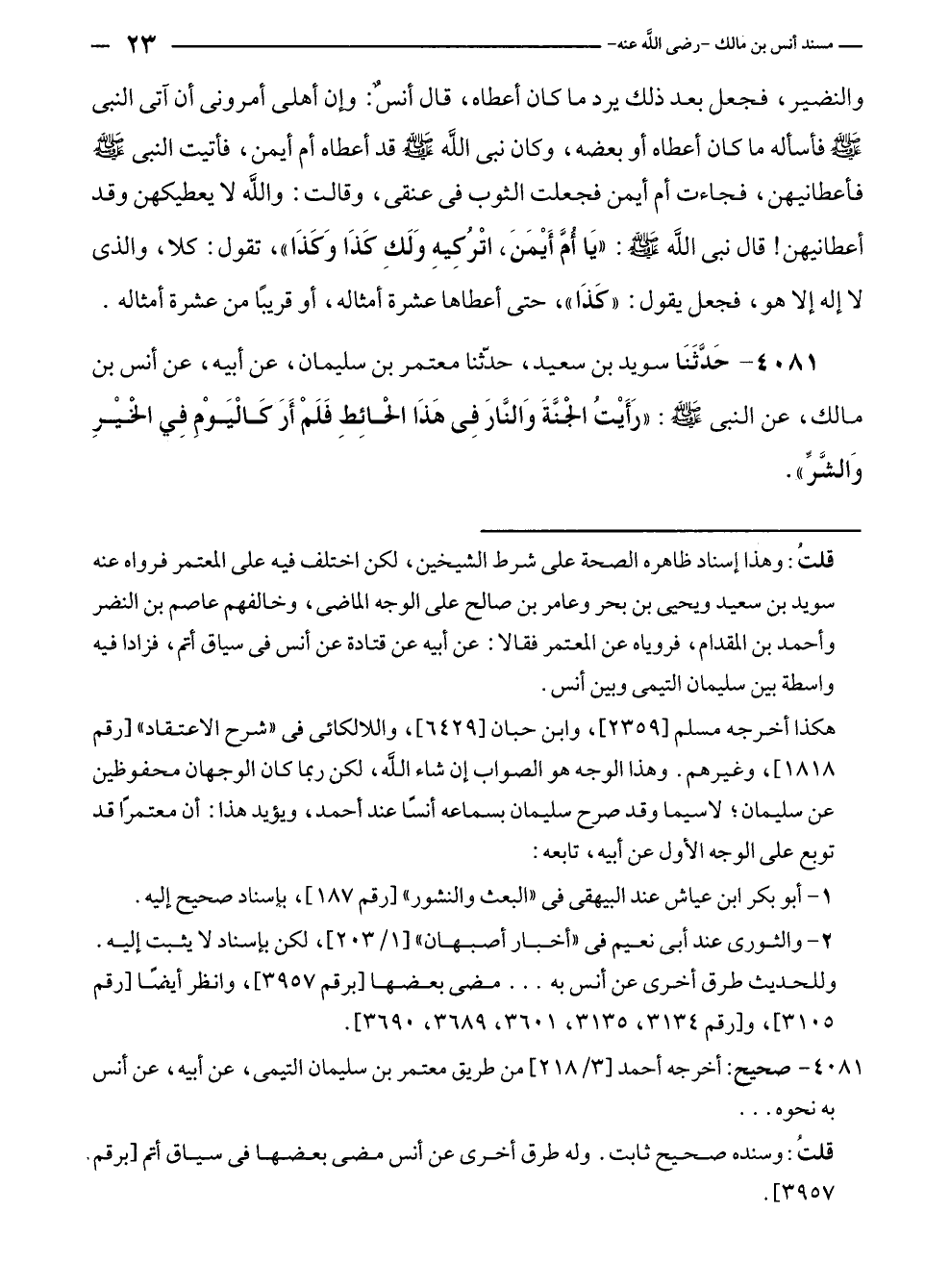 هكذا أخرجه مسلم [٢٣٥٩]، وابن حبان [٦٤٢٩]، واللالكائى في "شرح الاعتقاد" [رقم ١٨١٨]، وغيرهم. وهذا الوجه هو الصواب إن شاء الله، لكن ربما كان الوجهان محفوظين عن سليمان؛ لاسيما وقد صرح سليمان بسماعه أنسًا عند أحمد، ويؤيد هذا: أن معتمرًا قد توبع على الوجه الأول عن أبيه، تابعه: