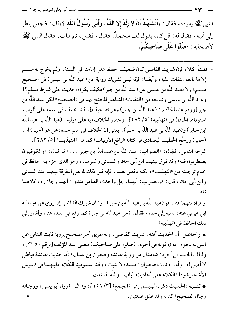 = قلتُ: كلا، فإن شريك القاضى كان ضعيف الحفظ على إمامته في السنة، ولم يخرج له مسلم إلا ما تابعه الثقات عليه؛ وأيضا: فإنه ليس لشريك رواية عن (عبد الله بن عيسى) في "صحيح مسلم" ولا لعبد الله بن عيسى عن (عبد الله بن جبر) فكيف يكون الحديث على شرط مسلم؟! وعبد الله بن عيسى وشيخه من "الثقات" المشاهير المحتج بهم في "الصحيح" لكن عبد الله بن جبر [ووقع عند الحاكم: (عبد الله بن جبير) وهو تصحيف]، قد اختلف في اسمه على ألوان، استوفاها الحافظ في "تهذيبه" [٥/ ٢٨٢]، وحصر الخلاف فيه على قوليه: (عبد الله بن عبد الله بن جابر) و (عبد الله بن عبد الله بن جبر)، يعنى أن الخلاف في اسم جده، هل هو (جبر) أم: (جابر) ورجَّح الخطيب البغدادى في كتابه "رافع الارتياب" كما في "التهذيب" [٥/ ٢٨٢].