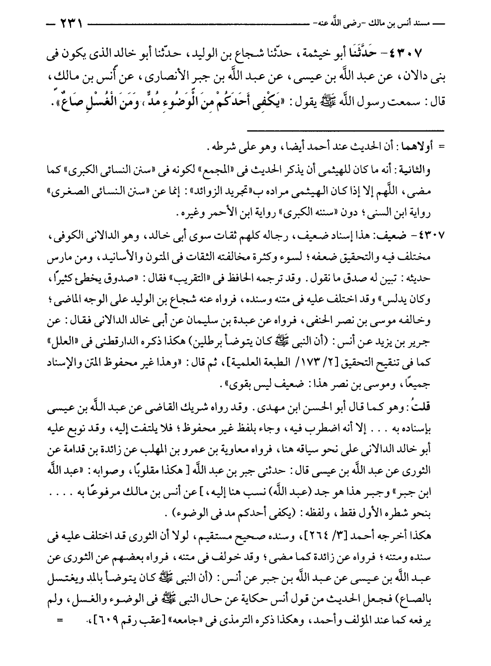 قلتُ: وهو كما قال أبو الحسن بن مهدى. وقد رواه شريك القاضى عن عبد الله بن عيسى بإسناده به ... إلا أنه اضطرب فيه، وجاء بلفظ غير محفوظ؛ فلا يلتفت إليه، وقد توبع عليه أبو خالد الدالانى على نحو سياقه هنا، فرواه معاوية بن عمرو بن المهلب عن زائدة بن قدامة عن الثورى عن عبد الله بن عيسى قال: حدثنى جبر بن عبد الله [هكذا مقلوبًا، وصوابه: "عبد الله بن جبر" وجبر هذا هو جد (عبد الله) نسب هنا إليه،] عن أنس بن مالك مرفوعًا به .... بنحو شطره الأول فقط، ولفظه: (يكفى أحدكم مد في الوضوء).