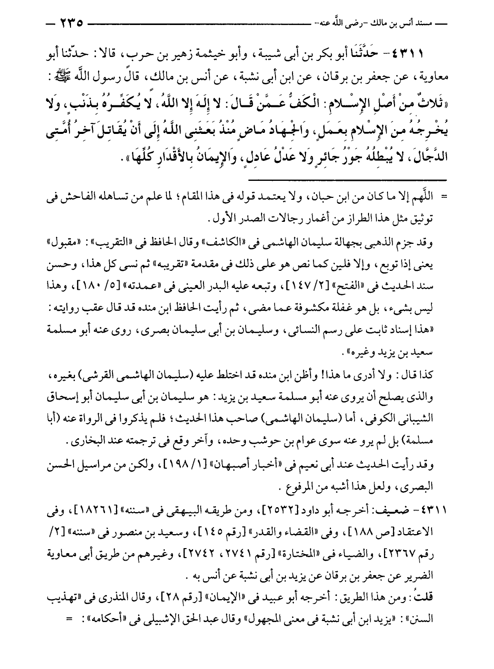 ٤٣١١ - حَدَّثَنَا أبو بكر بن أبى شيبة، وأبو خيثمة زهير بن حرب، قالا: حدّثنا أبو معاوية، عن جعفر بن برقان، عن ابن أبى نشبة، عن أنس بن مالكٍ، قال رسول الله - صلى الله عليه وسلم -: "ثَلاثٌ مِنْ أَصْلِ الإِسْلامِ: الْكَفُّ عَمَّنْ قَالَ: لا إِلَهَ إِلا اللهُ، لا يُكَفِّرُهُ بِذَنْبٍ، وَلا يُخْرِجُهُ مِنَ الإِسْلامِ بِعَمَلٍ، وَالجهَادُ مَاضٍ مُنْذُ بَعَثَنِى الله إِلَى أَنْ يُقَاتِلَ آخِرُ أُمَّتِى الدَّجَّالَ، لا يبْطِلُهُ جَوْرُ جَائِرٍ وَلا عَدْلُ عَادِلٍ، وَالإيمَانُ بِالأَقْدَارِ كُلِّهَا".