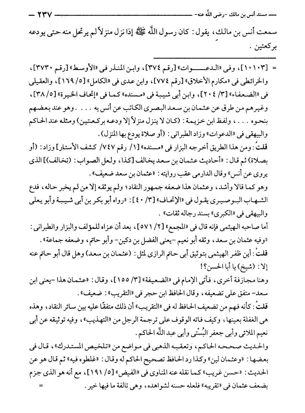 = [١٠١٠٣]، وفى "الدعوات" [رقم ٣٧٤]، وابن المنذر في "الأوسط" [رقم ٣٧٣٠]، والخرائطى في "مكارم الأخلاق" [رقم ٧٧٤]، وابن عدى في "الكامل" [٥/ ١٦٩]، والعقيلى في "الضعفاء" [٣/ ٢٠٤]، وابن أبي شيبة في "مسنده" كما في "إتحاف الخيرة" [٥/ ٣٨]، وغيرهم من طرق عن عثمان بن سعد البصرى الكاتب عن أنس يه .... وهو عند بعضهم بنحوه .. ، ولفظ ابن خزيمة: (كان لا ينزل منزلًا إلا ودعه بركعتين) ومثله عند الحاكم والبيهقى في "الدعوات" وزاد الطبراني: (أو صلاة يودع بها المنزل).
