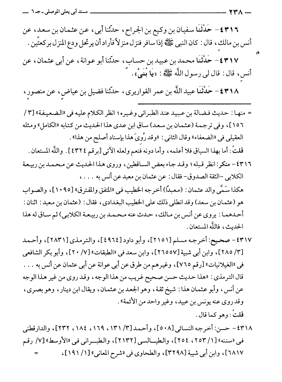 ٤٣١٧ - صحيح: أخرجه مسلم [٢١٥١]، وأبو داود [٤٩٦٤]، والترمذى [٢٨٣١]، وأحمد [٣/ ٢٨٥]، وابن أبى شبية [٢٦٥٥٧]، وابن سعد في "الطبقات" [٧/ ٢٠]، وأبو بكر الشافعي في "الغيلانيات" [رقم ٧٦٥]، وغيرهم من طرق عن أبى عوانة عن أبى عثمان عن أنس به ...