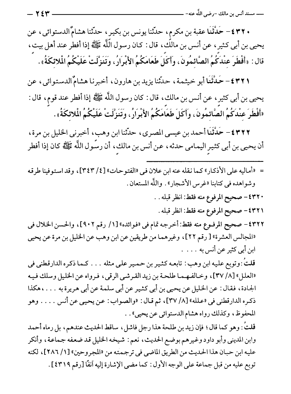 ٤٣٢٠ - حَدَّثَنَا عقبة بن مكرمٍ، حدّثنا يونس بن بكير، حدّثنا هشامٌ الدستوائى، عن يحيى بن أبى كثيرٍ، عن أنس بن مالكٍ، قال: كان رسول الله - صلى الله عليه وسلم - إذا أفطر عند أهل بيتٍ، قال: "أَفْطَرَ عِنْدَكُمُ الصَّائِمُونَ، وَأَكَلَ طَعَامَكُمُ الأبْرَارُ، وَتَنَزَّلَتْ عَلَيْكُمُ الملائِكَةُ".