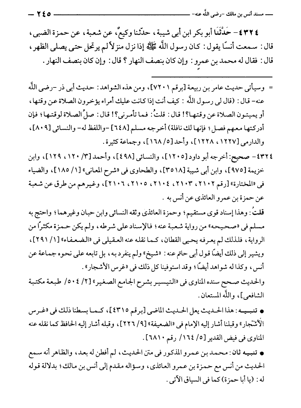 ٤٣٢٤ - حَدَّثَنَا أبو بكر بن أبى شيبة، حدّثنا وكيعٌ، عن شعبة، عن حمزة الضبى، قال: سمعت أنسًا يقول: كان رسول الله - صلى الله عليه وسلم - إذا نزل منزلًا لم يرتحل حتى يصلى الظهر، قال: فقال له محمد بن عمرٍو: وإن كان بنصف النهار؟ قال: إن كان بنصف النهار.