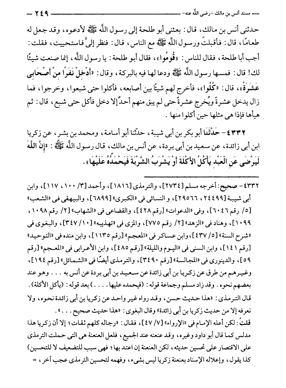 ٤٣٣٢ - حَدَّثَنَا أبو بكر بن أبى شيبة، حدّثنا أبو أسامة، ومحمد بن بشر، عن زكريا بن أبى زائدة، عن سعيد بن أبى بردة، عن أنس بن مالكٍ، قال رسول الله - صلى الله عليه وسلم -: "إِنَّ اللَّهَ لَيَرْضَى عَنِ الْعَبْدِ يَأْكُلُ الأَكْلَةَ أَوْ يَشْرَبُ الشَّرْبَةَ فَيَحْمَدُهُ عَلَيْهَا".