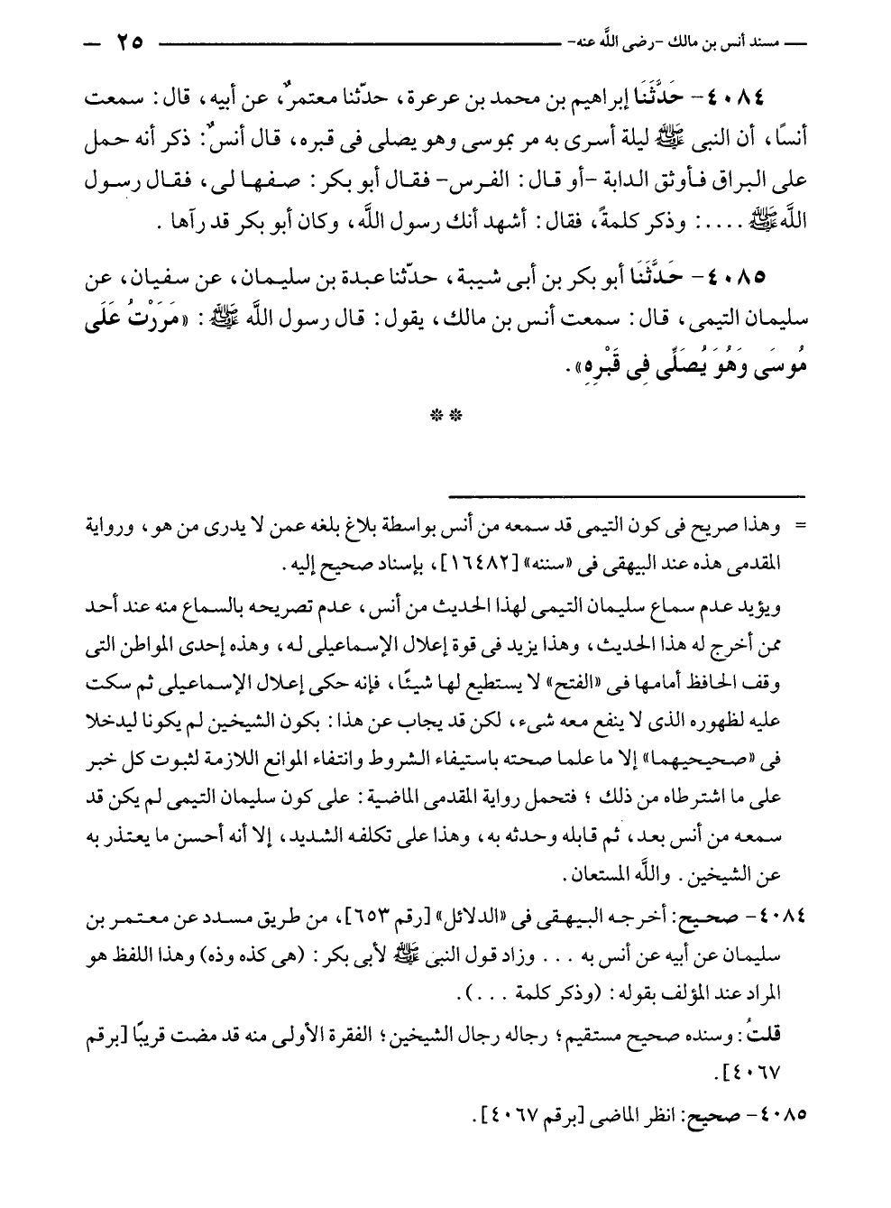 ٤٠٨٥ - حَدَّثَنَا أبو بكر بن أبي شيبة، حدّثنا عبدة بن سليمان، عن سفيان، عن سليمان التيمي، قال: سمعت أنس بن مالك، يقول: قال رسول الله - صلى الله عليه وسلم -: "مَرَرْتُ عَلَى مُوسَى وَهُوَ يُصَلِّى فِي قَبْرِهِ".