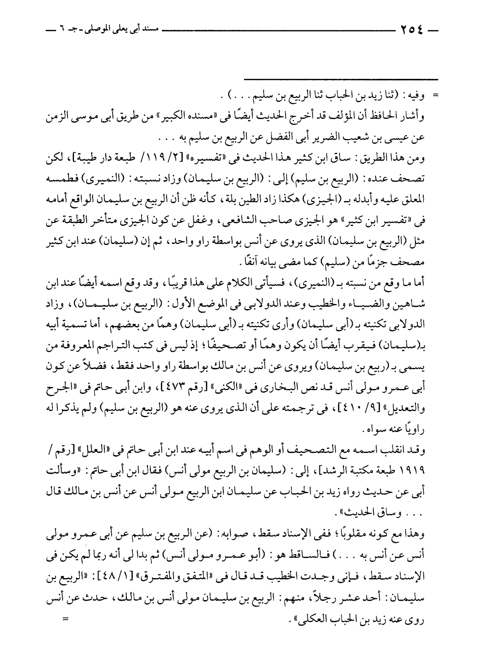 وهذا مع كونه مقلوبًا، ففى الإسناد سقط، صوابه: (عن الربيع بن سليم عن أبى عمرو مولى أنس عن أنس به ... ) فالساقط هو: (أبو عمرو مولى أنس) ثم بدا لى أنه ربما لم يكن في الإسناد سقط، فإنى وجدت الخطيب قد قال في "المتفق والمفترق" [١/ ٤٨]: "الربيع بن سليمان: أحد عشر رجلًا، منهم: الربيع بن سليمان مولى أنس بن مالك، حدث عن أنس روى عنه زيد بن الحباب العكلى". =