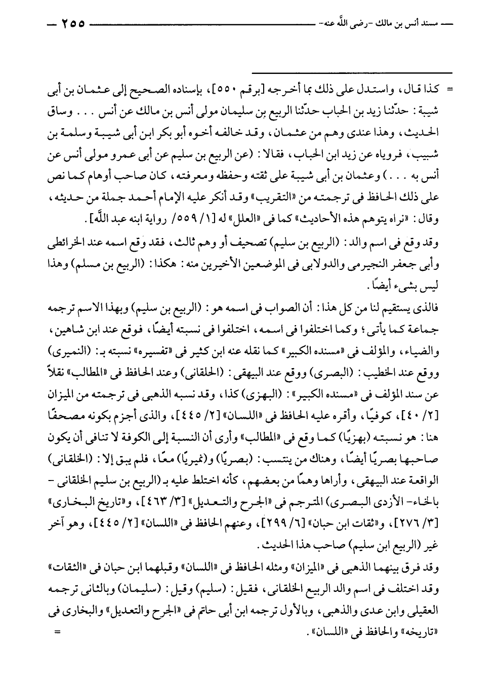 = كذا قال، واستدل على ذلك بما أخرجه [برقم ٥٥٠]، بإسناده الصحيح إلى عثمان بن أبى شيبة: حدّثنا زيد بن الحباب حدّثنا الربيع بن سليمان مولى أنس بن مالك عن أنس ... وساق الحديث، وهذا عندى وهم من عثمان، وقد خالفه أخوه أبو بكر بن أبى شيبة وسلمة بن شبيب، فروياه عن زيد بن الحباب، فقالا: (عن الربيع بن سليم عن أبى عمرو مولى أنس عن أنس به ... ) وعثمان بن أبى شيبة على ثقته وحفظه ومعرفته، كان صاحب أوهام كما نص على ذلك الحافظ في ترجمته من "التقريب" وقد أنكر عليه الإمام أحمد جملة من حديثه، وقال: "نراه يتوهم هذه الأحاديث" كما في "العلل" له [١/ ٥٥٩/ رواية ابنه عبد الله].