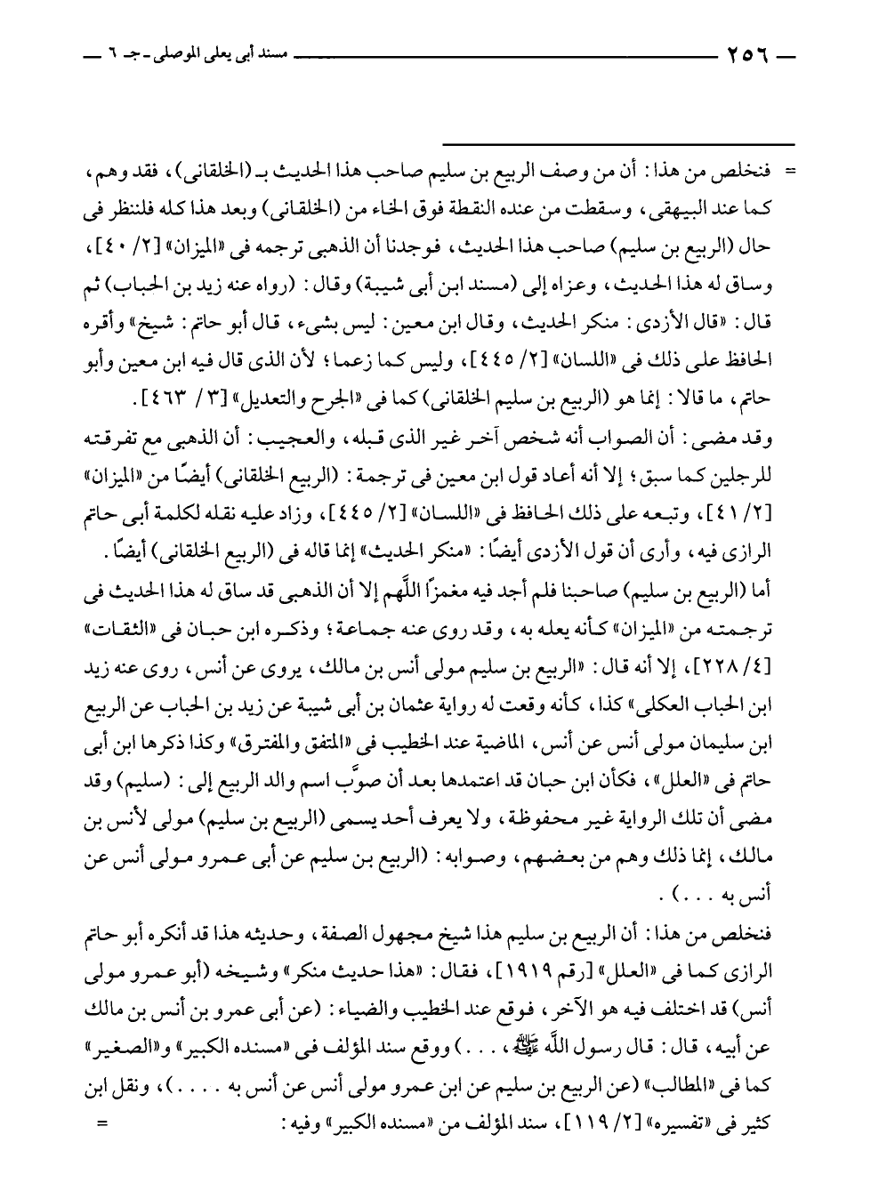 فنخلص من هذا: أن الربيع بن سليم هذا شيخ مجهول الصفة، وحديثه هذا قد أنكره أبو حاتم الرازى كما في "العلل" [رقم ١٩١٩]، فقال: "هذا حديث منكر" وشيخه (أبو عمرو مولى أنس) قد اختلف فيه هو الآخر، فوقع عند الخطيب والضياء: (عن أبى عمرو بن أنس بن مالك عن أبيه، قال: قال رسول الله - صلى الله عليه وسلم - ... ) ووقع سند المؤلف في "مسنده الكبير" و"الصغير" كما في "المطالب" (عن الربيع بن سليم عن ابن عمرو مولى أنس عن أنس به .... )، ونقل ابن كثير في "تفسيره" [٢/ ١١٩]، سند المؤلف من "مسنده الكبير" وفيه: =