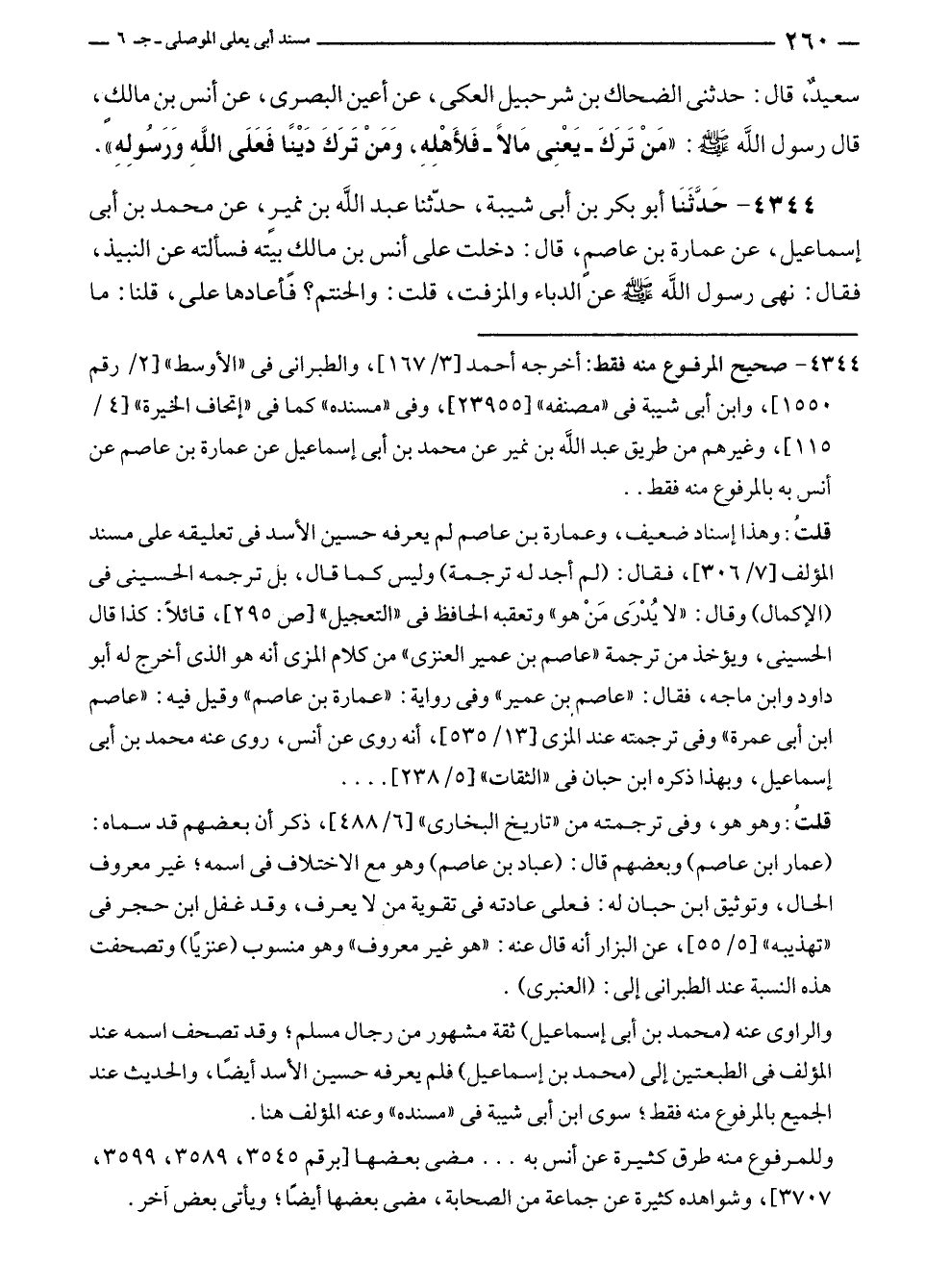 ٤٣٤٤ - صحيح المرفوع منه فقط: أخرجه أحمد [٣/ ١٦٧]، والطبرانى في "الأوسط" [٢/ رقم ١٥٥٠]، وابن أبى شيبة في "مصنفه" [٢٣٩٥٥]، وفى "مسنده" كما في "إتحاف الخيرة" [٤/ ١١٥]، وغيرهم من طريق عبد الله بن نمير عن محمد بن أبى إسماعيل عن عمارة بن عاصم عن أنس به بالمرفوع منه فقط ..