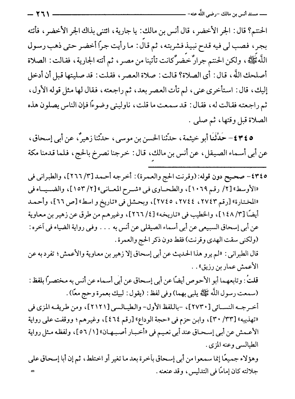 ٤٣٤٥ - حَدَّثَنَا أبو خيثمة، حدّثنا الحسن بن موسى، حدّثنا زهيرٌ، عن أبى إسحاق، عن أبى أسماء الصيقل، عن أنس بن مالكٍ، قال: خرجنا نصرخ بالحج، فلما قدمنا مكة