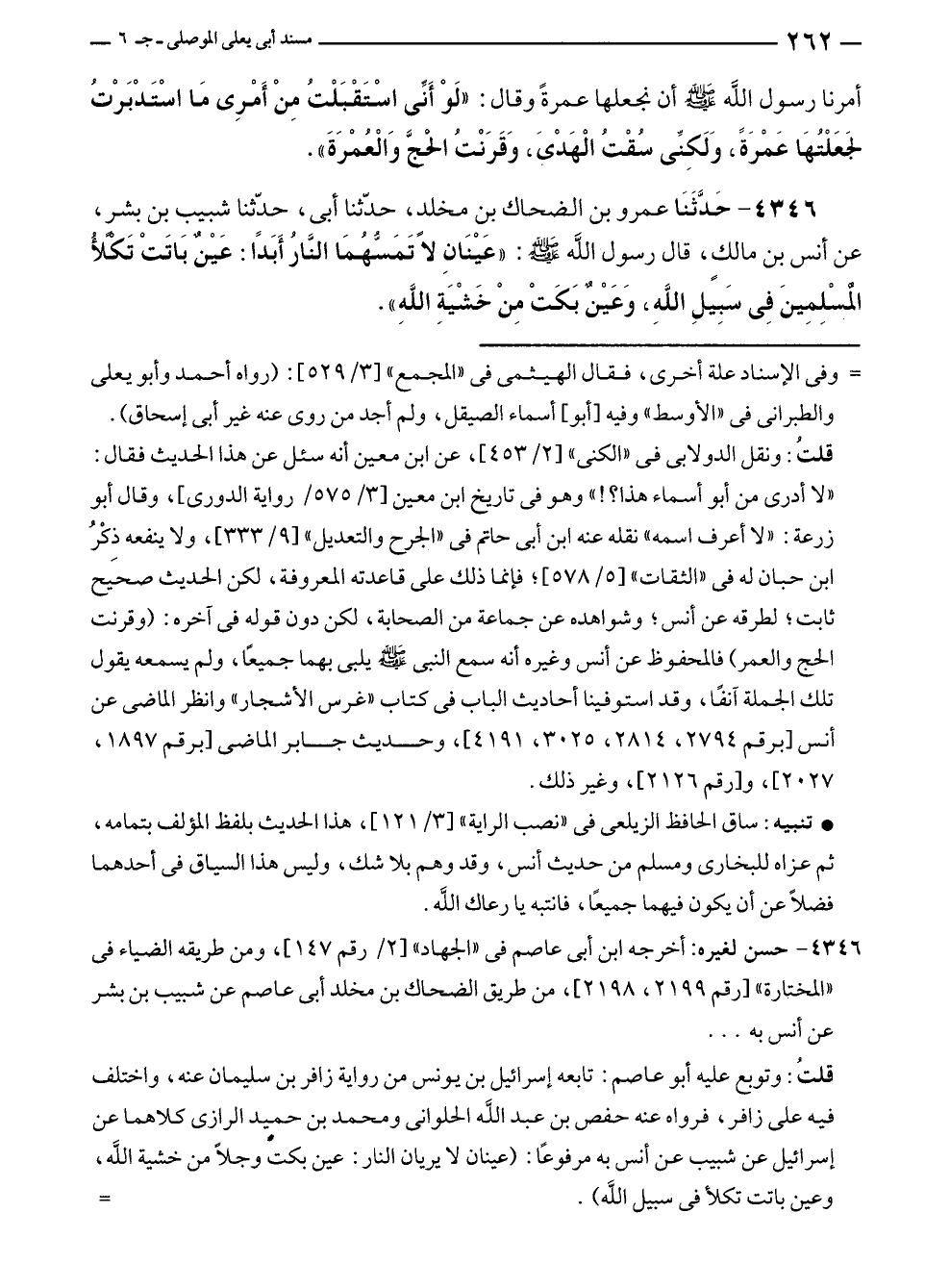 ٤٣٤٦ - حَدَّثَنَا عمرو بن الضحاك بن مخلد، حدّثنا أبي، حدّثنا شبيب بن بشرٍ، عن أنس بن مالك، قال رسول الله - صلى الله عليه وسلم -: "عَيْنَانِ لا تَمَسُّهُمَا النَّارُ أَبَدًا: عَيْنٌ بَاتَتْ تَكْلأُ الْمُسْلِمِينَ فِي سَبِيلِ اللهِ، وَعَيْنٌ بَكَتْ مِنْ خَشْيَةِ اللهِ".