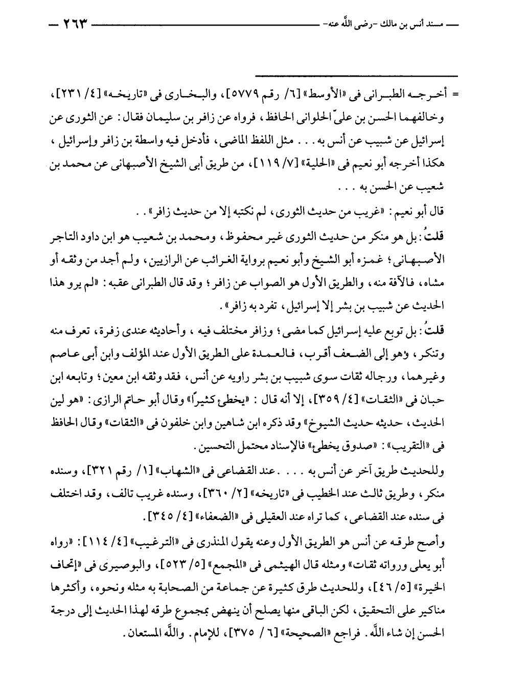 = أخرجه الطبراني في "الأوسط" [٦/ رقم ٥٧٧٩]، والبخارى في "تاريخه" [٤/ ٢٣١]، وخالفهما الحسن بن عليّ الحلوانى الحافظ، فرواه عن زافر بن سليمان فقال: عن الثورى عن إسرائيل عن شبيب عن أنس به ... مثل اللفظ الماضى، فأدخل فيه واسطة بن زافر وإسرائيل، هكذا أخرجه أبو نعيم في "الحلية" [٧/ ١١٩]، من طريق أبى الشيخ الأصبهانى عن محمد بن شعيب عن الحسن به ...