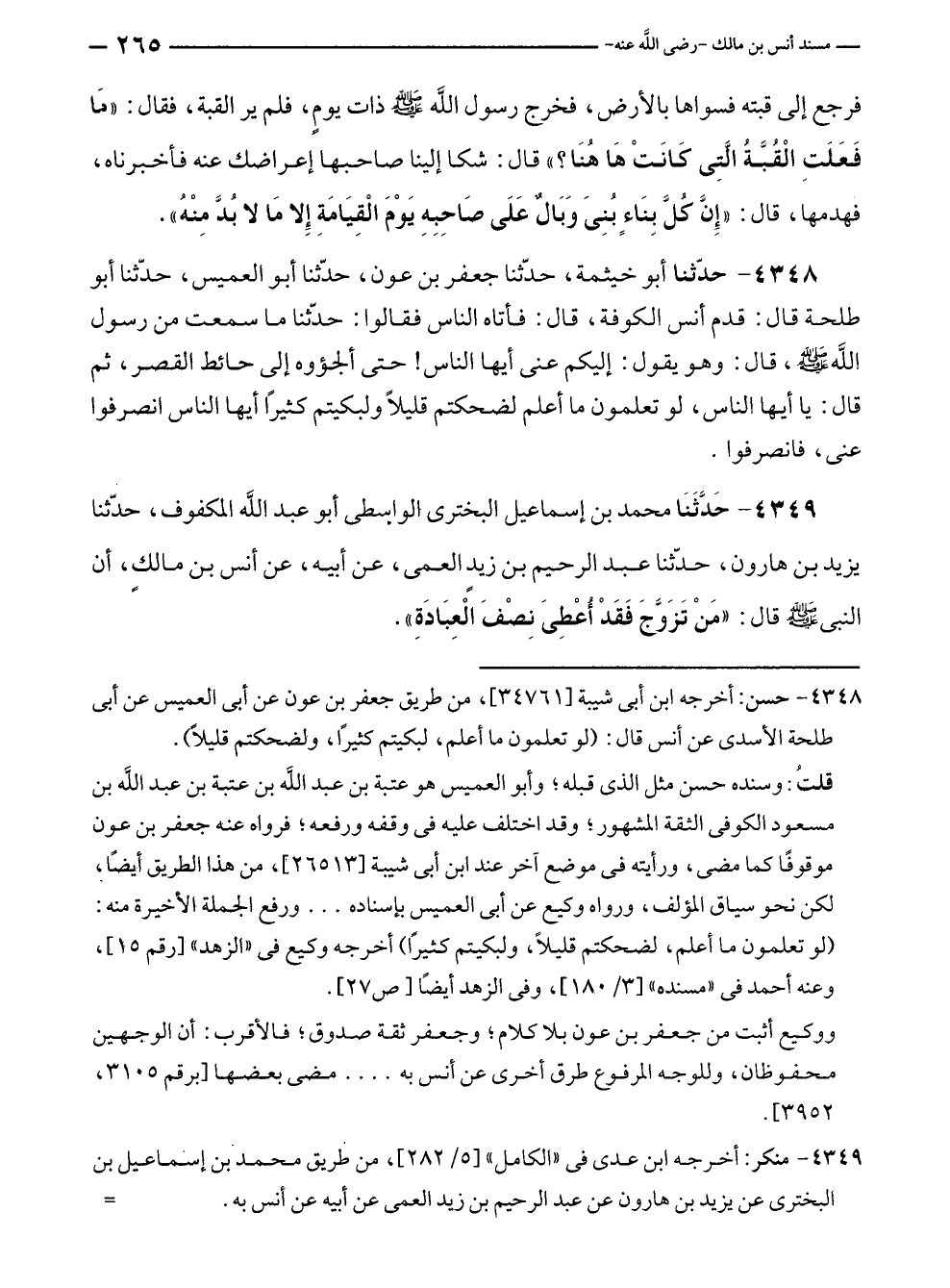 ٤٣٤٨ - حدّثنا أبو خيثمة، حدّثنا جعفر بن عون، حدّثنا أبو العميس، حدّثنا أبو طلحة قال: قدم أنس الكوفة، قال: فأتاه الناس فقالوا: حدّثنا ما سمعت من رسول الله - صلى الله عليه وسلم -، قال: وهو يقول: إليكم عنى أيها الناس حتى ألجؤوه إلى حائط القصر، ثم قال: يا أيها الناس، لو تعلمون ما أعلم لضحكتم قليلًا ولبكيتم كثيرًا أيها الناس انصرفوا عنى، فانصرفوا.