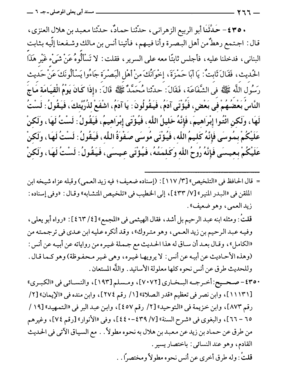 ٤٣٥٠ - حَدَّثَنَا أبو الربيع الزهرانى، حدّثنا حمادٌ، حدّثنا معبد بن هلالٍ العنزى، قال: اجتمع رهطٌ من أهل البصرة وأنا فيهم، فأتينا أنس بن مالك وشفعنا إليه بثابتٍ البنانى، فدخلنا عليه، فأجلس ثابتًا معه على السرير، فقلت: لا تَسْألُوهُ عَنْ شَىْءٍ غَيْرِ هَذَا الحدِيثِ، فَقَالَ ثَابِتٌ: يَا أبَا حَمْزَةَ، إِخْوَانُكَ مِنْ أهْلِ الْبَصْرَةِ جَاءُوا يَسْألُونَكَ عَنْ حَدِيثِ رَسُولِ الَلَّهِ - صلى الله عليه وسلم - فِي الشَّفَاعَةِ، فَقَالَ: حدّثنا مُحَمَّدٌ - صلى الله عليه وسلم - قَالَ: "إذَا كَانَ يَوْمُ القِيَامَةِ مَاجَ النَّاسُ بَعْضُهُمْ فِي بَعْضٍ، فَيُؤْتَى آدَمُ، فَيَقُولُونَ: يَا آدَمُ، اشْفَعْ لِذرِّيَّتِكَ، فَيَقُولُ: لَسْتُ لَهَا، وَلَكِنِ ائْتُوا إبرَاهِيمَ، فَإنَّهُ خَلِيلُ اللِه، فَيُؤْتَى إبرَاهِيمُ، فَيَقُولُ: لَسْتُ لَهَا، وَلَكِنْ عَلَيْكُمْ بِمُوسَى فَإنَّهُ كَلِيمُ اللَّهِ، فَيُؤْتَى مُوسَى صَفْوَةُ اللَّهِ، فَيَقولُ: لَسْتُ لَهَا، وَلَكِنْ عَلَيْكمْ بِعِيسَى فَإنَّهُ رُوحُ اللهِ وَكَلِمَتُهُ، فَيُؤْتَى عِيسَى، فَيَقُولُ: لَسْتُ لَهَا، وَلَكِنْ