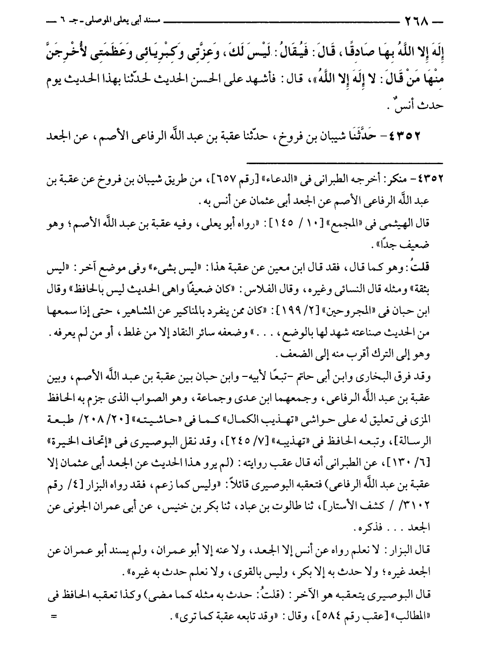 وقد فرق البخارى وابن أبى حاتم - تبعًا لأبيه - وابن حبان بين عقبة بن عبد الله الأصم، وبين عقبة بن عبد الله الرفاعى، وجمعهما ابن عدى وجماعة، وهو الصواب الذي جزم به الحافظ المزى في تعليق له على حواشى "تهذيب الكمال" كما في "حاشيته" [٢٠/ ٢٠٨/ طبعة الرسالة]، وتبعه الحافظ في "تهذيبه" [٧/ ٢٤٥]، وقد نقل البوصيرى في "إتحاف الخيرة" [٦/ ١٣٠]، عن الطبراني أنه قال عقب روايته: (لم يرو هذا الحديث عن الجعد أبى عثمان إلا عقبة بن عبد الله الرفاعى) فتعقبه البوصيرى قائلًا: "وليس كما زعم، فقد رواه البزار [٤/ رقم ٣١٠٢/ كشف الأستار]، ثنا طالوت بن عباد، ثنا بكر بن خنيس، عن أبى عمران الجونى عن الجعد ... فذكره.
