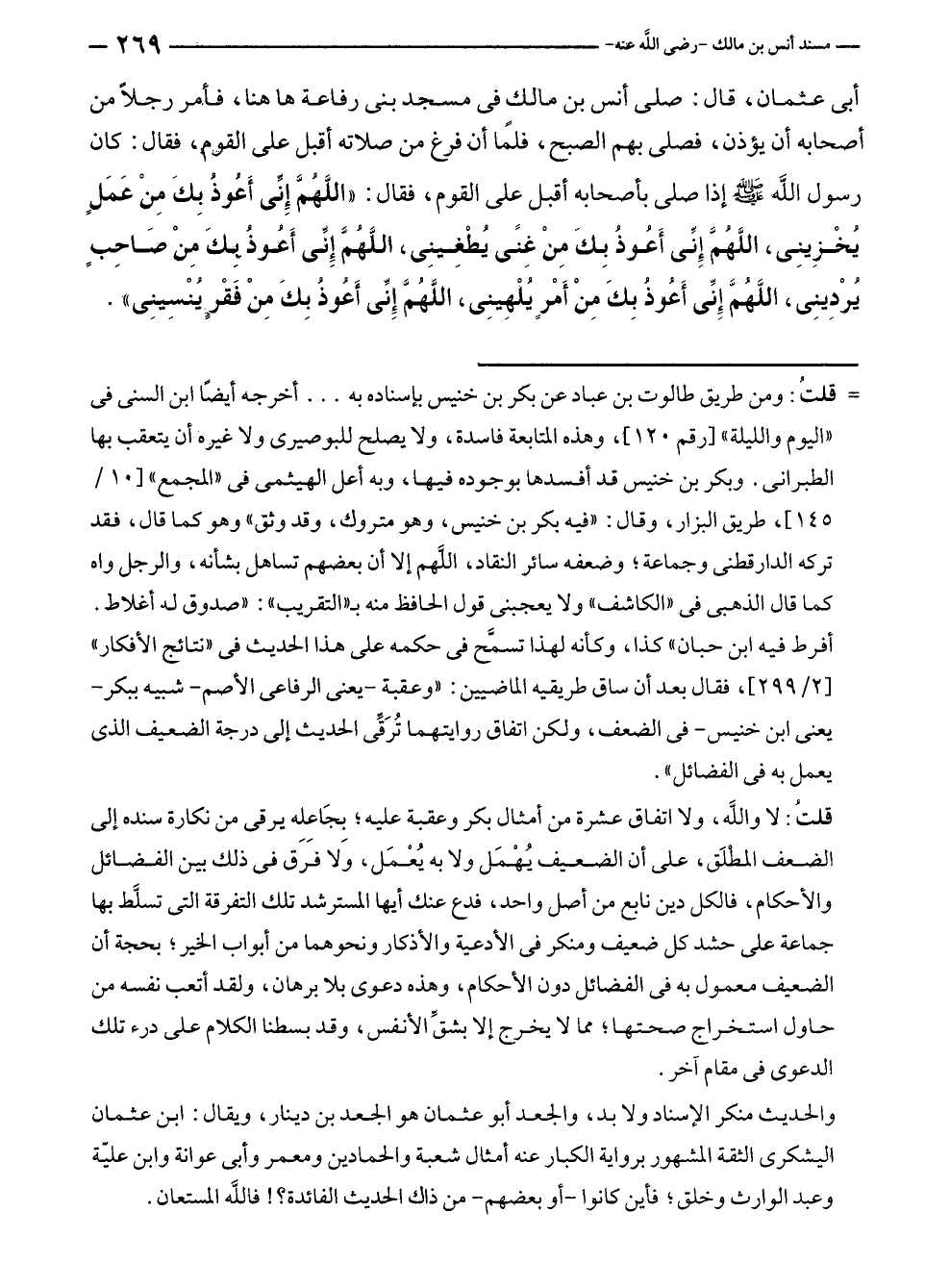 أبى عثمان، قال: صلى أنس بن مالك في مسجد بنى رفاعة ها هنا، فأمر رجلًا من أصحابه أن يؤذن، فصلى بهم الصبح، فلمًا أن فرغ من صلاته أقبل على القوم، فقال: كان رسول الله - صلى الله عليه وسلم - إذا صلى بأصحابه أقبل على القوم، فقال: "اللَّهُمَّ إنِّى أَعُوذُ بِكَ مِنْ عَمَلٍ يُخْزِينِى، اللَّهُمَّ إنِّى أَعُوذُ بِكَ مِنْ غِنًى يُطْغِينِى، اللَّهُمَّ إنِّى أَعُوذُ بِكَ مِنْ صَاحِبٍ يُرْدِينِى، اللَّهُمَّ إنِّى أَعُوذُ بِكَ مِنْ أَمْرٍ يُلْهِينِى، اللَّهُمَّ إنِّى أَعُوذُ بِكَ مِنْ فَقْرٍ يُنْسِينِى.