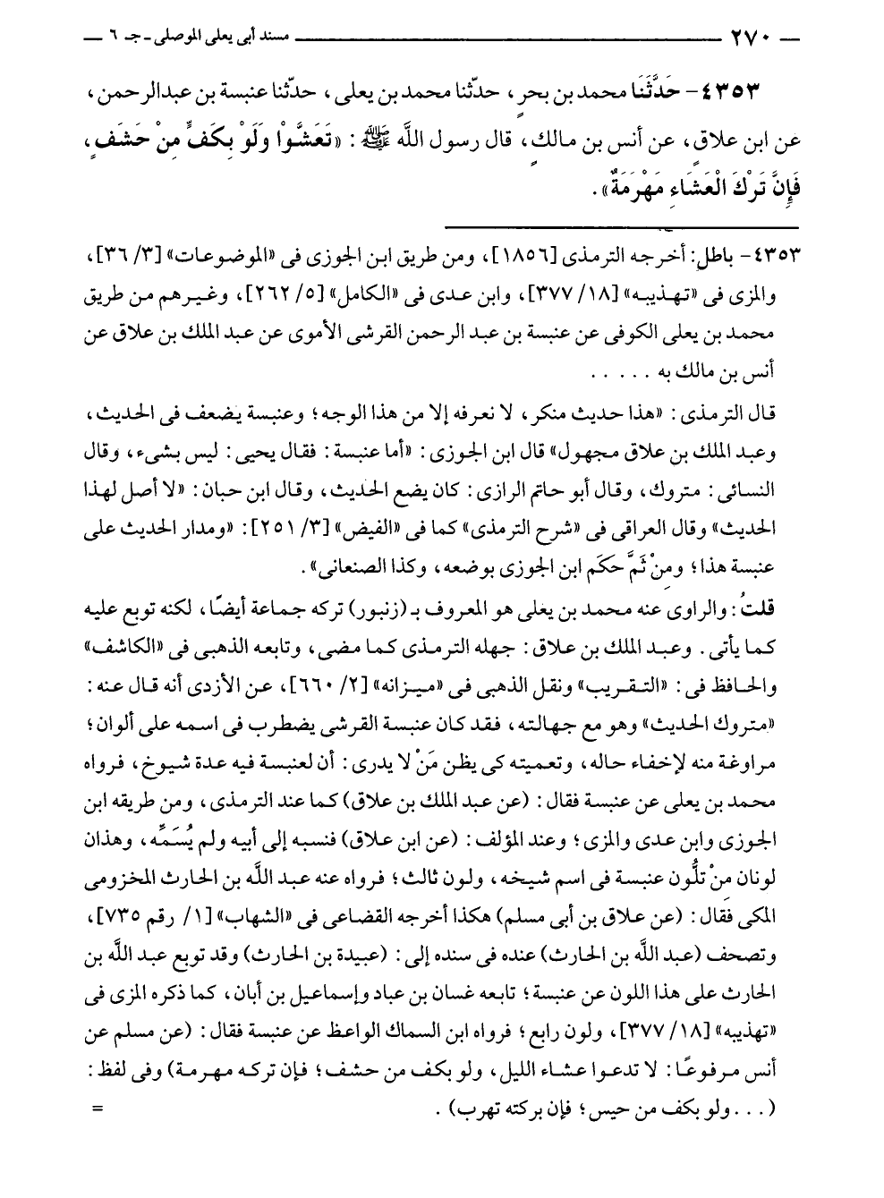 قلتُ: والراوى عنه محمد بن يعلى هو المعروف بـ (زنبور) تركه جماعة أيضًا، لكنه توبع عليه كما يأتى. وعبد الملك بن علاق: جهله الترمذى كما مضى، وتابعه الذهبى في "الكاشف" والحافظ في: "التقريب" ونقل الذهبى في "ميزانه" [٢/ ٦٦٠]، عن الأزدى أنه قال عنه: "متروك الحديث" وهو مع جهالته، فقد كان عنبسة القرشى يضطرب في اسمه على ألوان؛ مراوغة منه لإخفاء حاله، وتعميته كى يظن مَنْ لا يدرى: أن لعنبسة فيه عدة شيوخ، فرواه محمد بن يعلى عن عنبسة فقال: (عن عبد الملك بن علاق) كما عند الترمذى، ومن طريقه ابن الجوزى وابن عدى والمزى؛ وعند المؤلف: (عن ابن علاق) فنسبه إلى أبيه ولم يُسَمِّه، وهذان لونان مِنْ تلُّون عنبسة في اسم شيخه، ولون ثالث؛ فرواه عنه عبد الله بن الحارث المخزومى المكى فَقال: (عن علاق بن أبى مسلم) هكذا أخرجه القضاعى في "الشهاب" [١/ رقم ٧٣٥]، وتصحف (عبد الله بن الحارث) عنده في سنده إلى: (عبيدة بن الحارث) وقد توبع عبد الله بن الحارث على هذا اللون عن عنبسة؛ تابعه غسان بن عباد وإسماعيل بن أبان، كما ذكره المزى في "تهذيبه" [١٨/ ٣٧٧]، ولون رابع؛ فرواه ابن السماك الواعظ عن عنبسة فقال: (عن مسلم عن أنس مرفوعًا: لا تدعوا عشاء الليل، ولو بكف من حشف؛ فإن تركه مهرمة) وفى لفظ: ( ... ولو بكف من حيس؛ فإن بركته تهرب). =