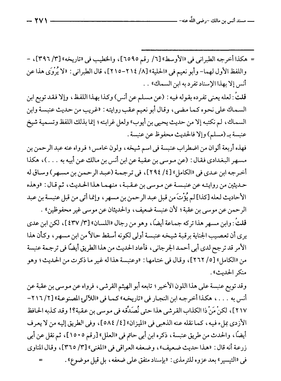 فهذه أربعة ألوان من اضطراب عنبسة في اسم شيخه، ولون خامس؛ فرواه عنه عبد الرحمن بن مسهر البغدادى فقال: (عن موسى بن عقبة عن ابن أنس بن مالك عن أبيه به ... )، هكذا أخرجه ابن عدى في "الكامل" [٤/ ٢٩٤]، في ترجمة (عبد الرحمن بن مسهر) وساق له حديثين من روايته عن عنبسة عن موسى بن عقبة، منهما هذا الحديث، ثم قال: "وهذه الأحاديث لعله [كذا] لم يُؤْتَ من قبل عبد الرحمن بن مسهر، وإنما أتى من قبل عنبسة بن عبد الرحمن عن موسى بن عقبة؛ لأن عنبسة ضعيف، والحديثان عن موسى غير محفوظين".