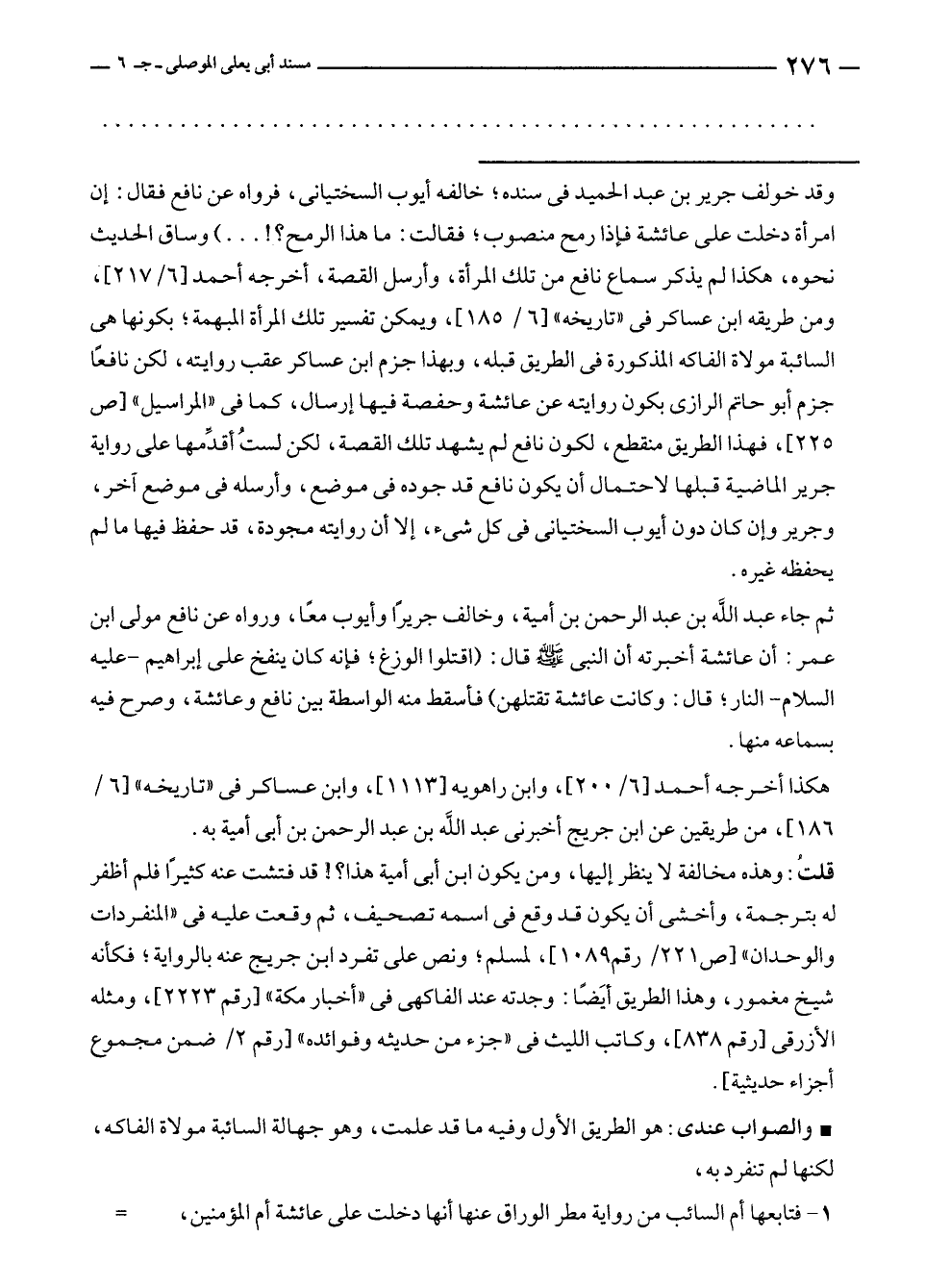 = وقد خولف جرير بن عبد الحميد في سنده؛ خالفه أيوب السختيانى، فرواه عن نافع فقال: إن امرأة دخلت على عائشة فإذا رمح منصوب؛ فقالت: ما هذا الرمح؟! ... ) وساق الحديث نحوه، هكذا لم يذكر سماع نافع من تلك المرأة، وأرسل القصة، أخرجه أحمد [٦/ ٢١٧]، ومن طريقه ابن عساكر في "تاريخه" [٦/ ١٨٥]، ويمكن تفسير تلك المرأة المبهمة؛ بكونها هي السائبة مولاة الفاكه المذكورة في الطريق قبله، وبهذا جزم ابن عساكر عقب روايته، لكن نافعًا جزم أبو حاتم الرازى بكون روايته عن عائشة وحفصة فيها إرسال، كما في "المراسيل" [ص ٢٢٥]، فهذا الطريق منقطع، لكون نافع لم يشهد تلك القصة، لكن لستُ أقدِّمها على رواية جرير الماضية قبلها لاحتمال أن يكون نافع قد جوده في موضع، وأرسله في موضع آخر، وجرير وإن كان دون أيوب السختيانى في كل شئ، إلا أن روايته مجودة، قد حفظ فيها ما لم يحفظه غيره.