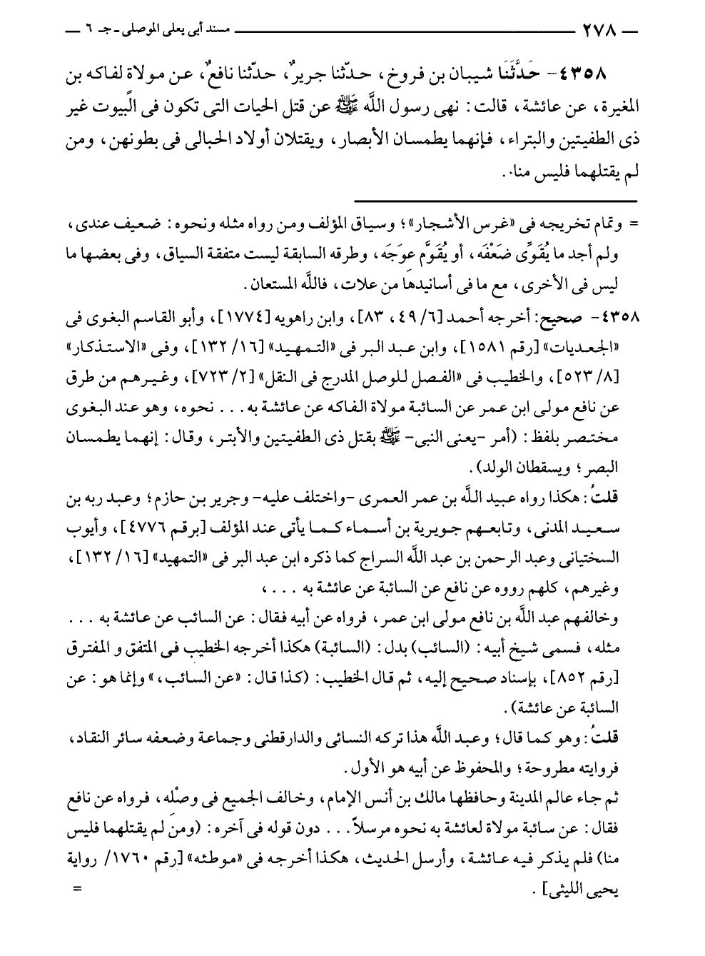 ٤٣٥٨ - حَدَّثَنَا شيبان بن فروخ، حدّثنا جريرٌ، حدّثنا نافعٌ، عن مولاة لفاكه بن المغيرة، عن عائشة، قالت: نهى رسول الله - صلى الله عليه وسلم - عن قتل الحيات التى تكون في البيوت غير ذى الطفيتين والبتراء، فإنهما يطمسان الأبصار، ويقتلان أولاد الحبالى في بطونهن، ومن لم يقتلهما فليس منا.