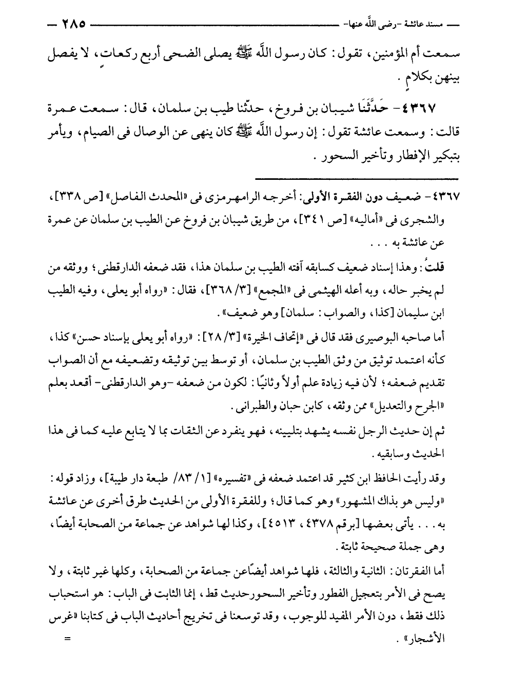 ٤٣٦٧ - حَدَّثَنَا شيبان بن فروخ، حدّثنا طيب بن سلمان، قال: سمعت عمرة قالت: وسمعت عائشة تقول: إن رسول الله - صلى الله عليه وسلم - كان ينهى عن الوصال في الصيام، ويأمر بتبكير الإفطار وتأخير السحور.