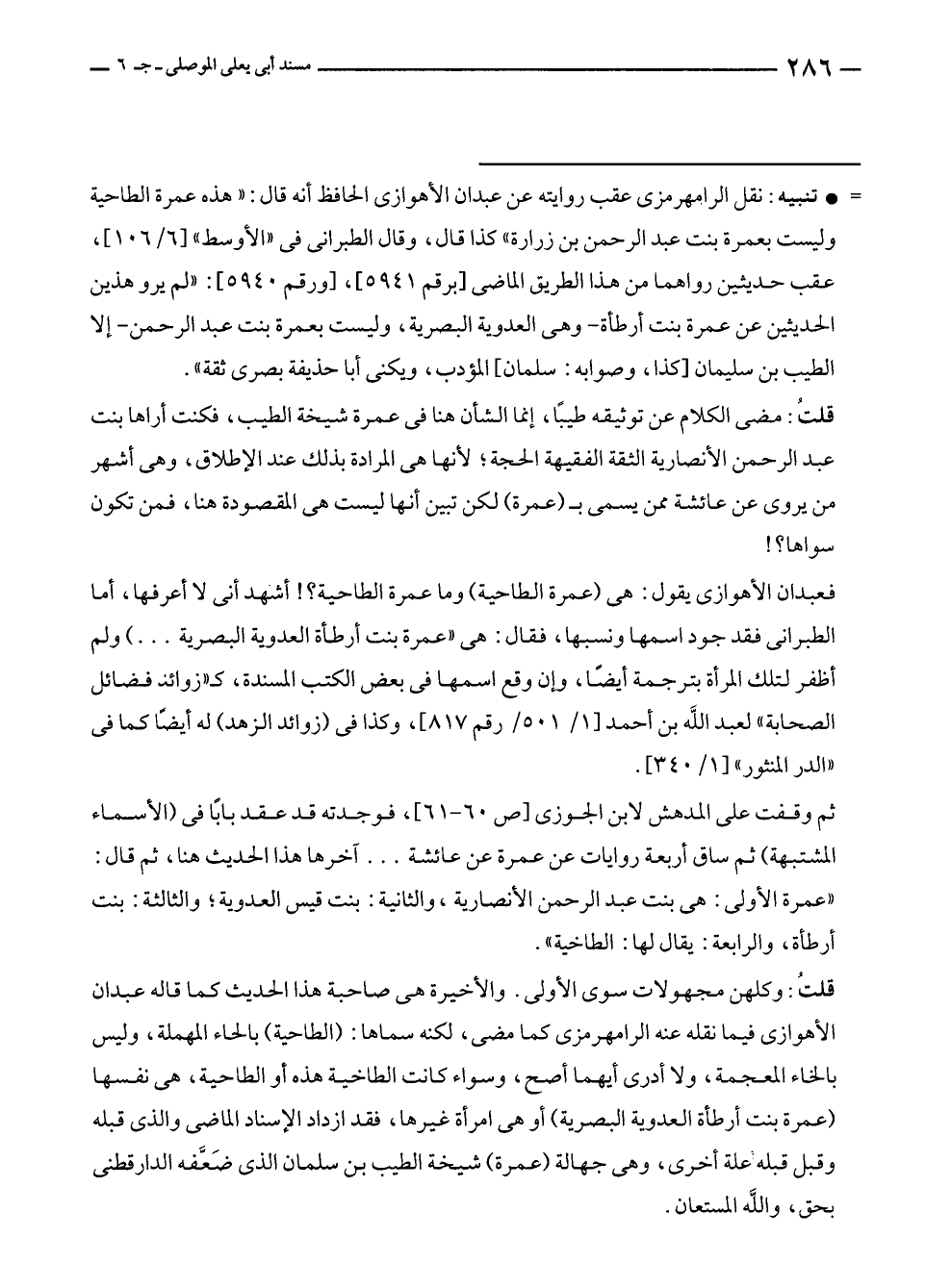 فعبدان الأهوازى يقول: هي (عمرة الطاحية) وما عمرة الطاحية؟! أشهد أنى لا أعرفها، أما الطبراني فقد جود اسمها ونسبها، فقال: هي "عمرة بنت أرطأة العدوية البصرية ... ) ولم أظفر لتلك المرأة بترجمة أيضًا، وإن وقع اسمها في بعض الكتب المسندة، كـ"زوائد فضائل الصحابة" لعبد الله بن أحمد [١/ ٥٠١/ رقم ٨١٧]، وكذا في (زوائد الزهد) له أيضًا كما في "الدر المنثور" [١/ ٣٤٠].
