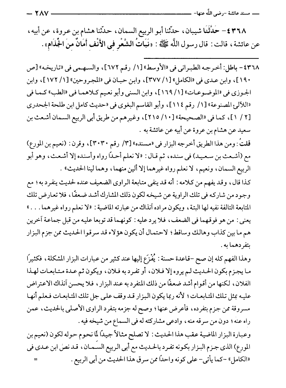 ٤٣٦٨ - حَدَّثَنَا شيبان، حدّثنا أبو الربيع السمان، حدّثنا هشام بن عروة، عن أبيه، عن عائشة، قالت: قال رسول الله - صلى الله عليه وسلم -: "نَبَات الشَّعْرِ فِي الأَنْفِ أَمَانٌ مِنَ الجذَامِ".