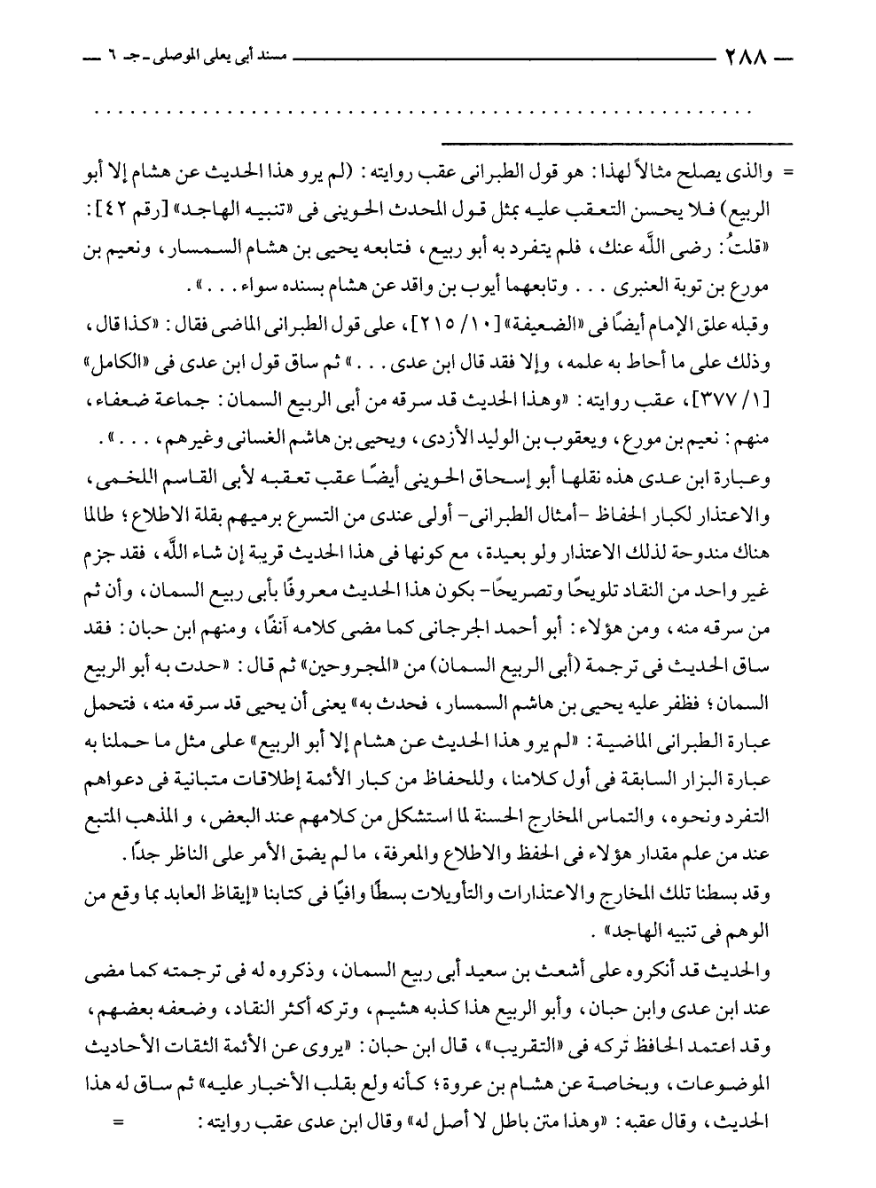 وعبارة ابن عدى هذه نقلها أبو إسحاق الحوينى أيضًا عقب تعقبه لأبى القاسم اللخمى، والاعتذار لكبار الحفاظ - أمثال الطبراني - أولى عندى من التسرع برميهم بقلة الاطلاع؛ طالما هناك مندوحة لذلك الاعتذار ولو بعيدة، مع كونها في هذا الحديث قريبة إن شاء الله، فقد جزم غير واحد من النقاد تلويحًا وتصريحًا - بكون هذا الحديث معروفًا بأبى ربيع السمان، وأن ثم من سرقه منه، ومن هؤلاء: أبو أحمد الجرجانى كما مضى كلامه آنفًا، ومنهم ابن حبان: فقد ساق الحديث في ترجمة (أبى الربيع السمان) من "المجروحين" ثم قال: "حدت به أبو الربيع السمان؛ فظفر عليه يحيى بن هاشم السمسار، فحدث به" يعنى أن يحيى قد سرقه منه، فتحمل عبارة الطبراني الماضية: "لم يرو هذا الحديث عن هشام إلا أبو الربيع" على مثل ما حملنا به عبارة البزار السابقة في أول كلامنا، وللحفاظ من كبار الأئمة إطلاقات متبانية في دعواهم التفرد ونحوه، والتماس المخارج الحسنة لما استشكل من كلامهم عند البعض، والمذهب المتبع عند من علم مقدار هؤلاء في الحفظ والاطلاع والمعرفة، ما لم يضق الأمر على الناظر جدًّا.