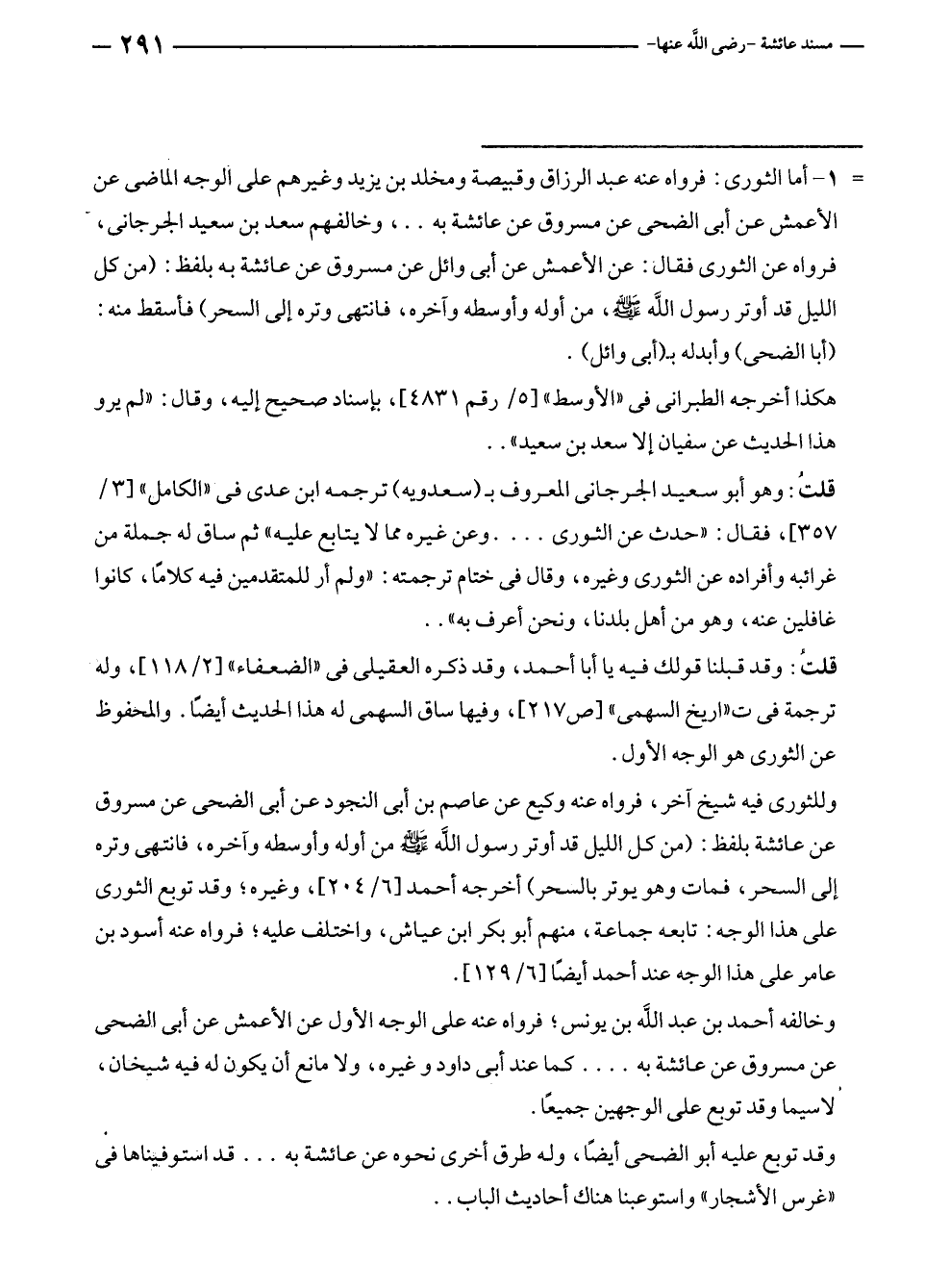 = ١ - أما الثورى: فرواه عنه عبد الرزاق وقبيصة ومخلد بن يزيد وغيرهم على الوجه الماضى عن الأعمش عن أبى الضحى عن مسروق عن عائشة به .. ، وخالفهم سعد بن سعيد الجرجانى، فرواه عن الثورى فقال: عن الأعمش عن أبى وائل عن مسروق عن عائشة به بلفظ: (من كل الليل قد أوتر رسول الله - صلى الله عليه وسلم -، من أوله وأوسطه وآخره، فانتهى وتره إلى السحر) فأسقط منه: (أبا الضحى) وأبدله بـ (أبى وائل).