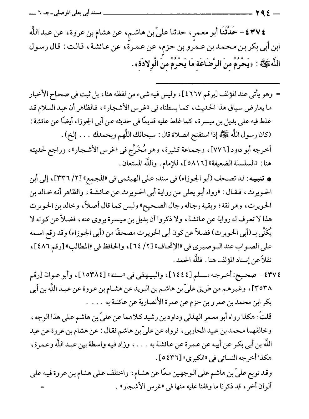 ٤٣٧٤ - حَدَّثَنَا أبو معمرٍ، حدثنا عليّ بن هاشمٍ، عن هشام بن عروة، عن عبد الله بن أبى بكر بن محمد بن عمرو بن حزمٍ، عن عمرة، عن عائشة، قالت: قال رسول الله - صلى الله عليه وسلم -: "يَحْرُمُ مِنَ الرَّضَاعَةِ مَا يَحْرُمُ مِنَ الْوِلادَةِ".