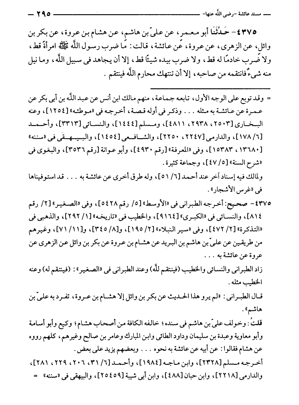 ٤٣٧٥ - حَدَّثَنَا أبو معمرٍ، عن عليّ بن هاشمٍ، عن هشام بن عروة، عن بكر بن وائلٍ، عن الزهرى، عن عروة، عن عائشة، قالت: ما ضرب رسول الله - صلى الله عليه وسلم - امرأةً قط، ولا ضرب خادمًا له قط، ولا ضرب بيده شيئًا قط، إلا أن يجاهد في سبيل الله، وما نيل منه شئٌ فانتقمه من صاحبه، إلا أن تنتهك محارم الله فينتقم.