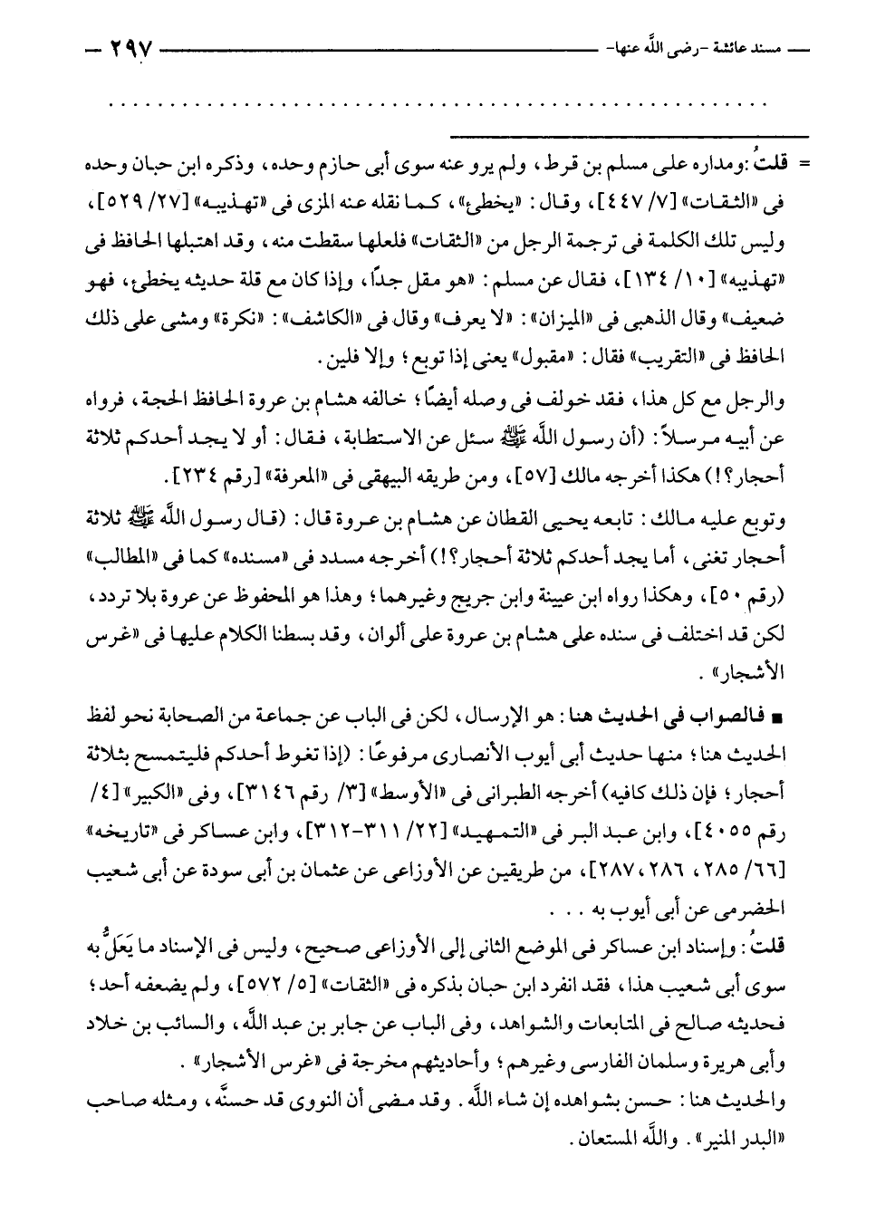 وتوبع عليه مالك: تابعه يحيى القطان عن هشام بن عروة قال: (قال رسول الله - صلى الله عليه وسلم - ثلاثة أحجار تغنى، أما يجد أحدكم ثلاثة أحجار؟!) أخرجه مسدد في "مسنده" كما في "المطالب" [رقم ٥٠]، وهكذا رواه ابن عيينة وابن جريج وغيرهما؛ وهذا هو المحفوظ عن عروة بلا تردد، لكن قد اختلف في سنده على هشام بن عروة على ألوان، وقد بسطنا الكلام عليها في "غرس الأشجار".
